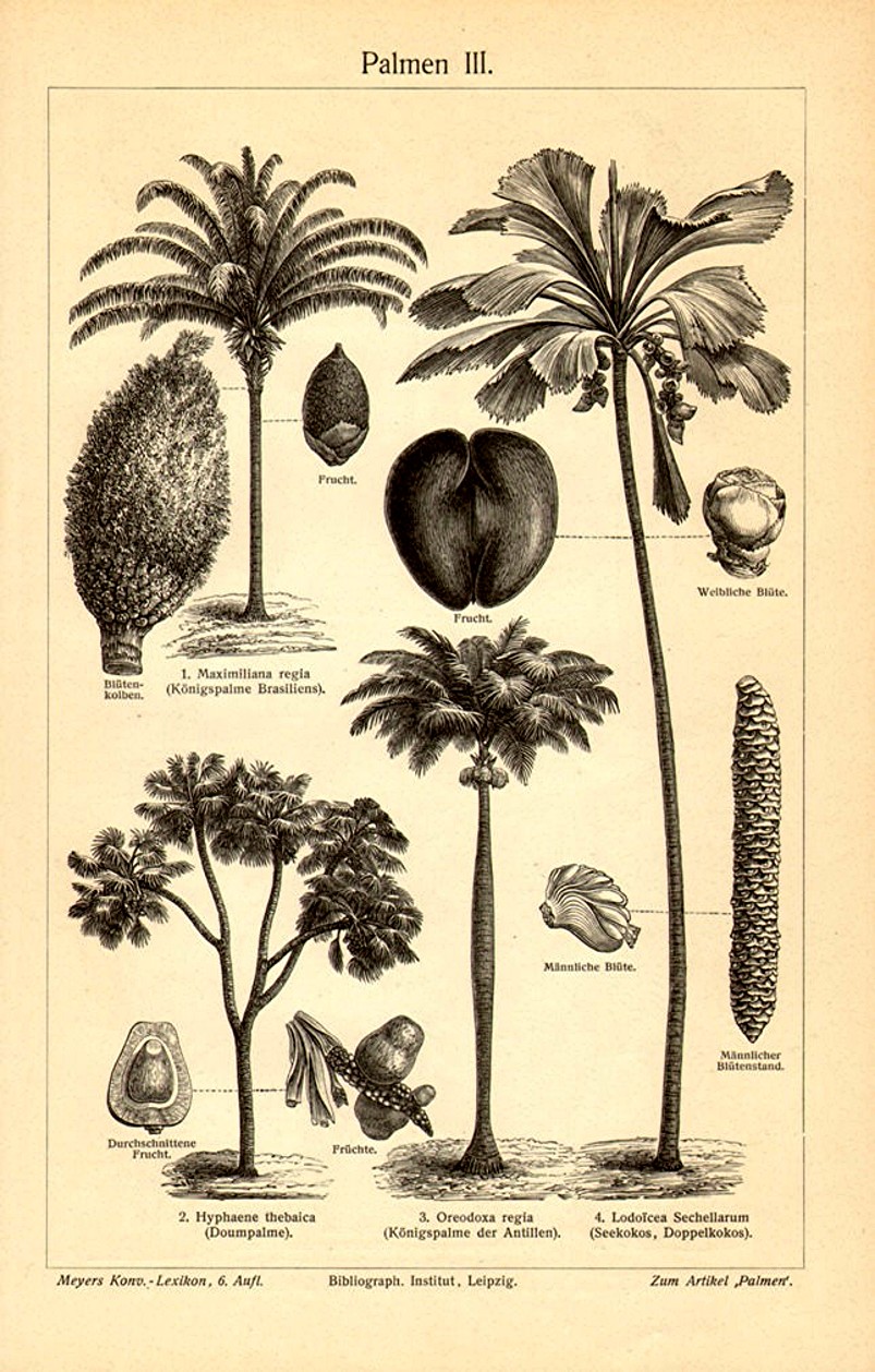 Exquisite engraving from 1897 depicting various palm trees, including the coco-de-mer at right of image together with its unmistakeable double coconut and catkin-like male inflorescence (public domain)Produced by female coco-de-mer trees, the fruit measures 16-20 in across, weighs 33-66 lb (up to 39 lb of which is the weight of the seed inside it), and takes 6-7 years to mature, plus a minimum of two further years to germinate. The seed's bilobed shape infamously lends it more than a passing resemblance in form to a woman's buttocks on one side and to her stomach and thighs on the other side (resulting in it becoming a potent fertility symbol in the Seychelles and also nurturing a traditional belief there that its pulpy white meat possesses powerful aphrodisiac properties).