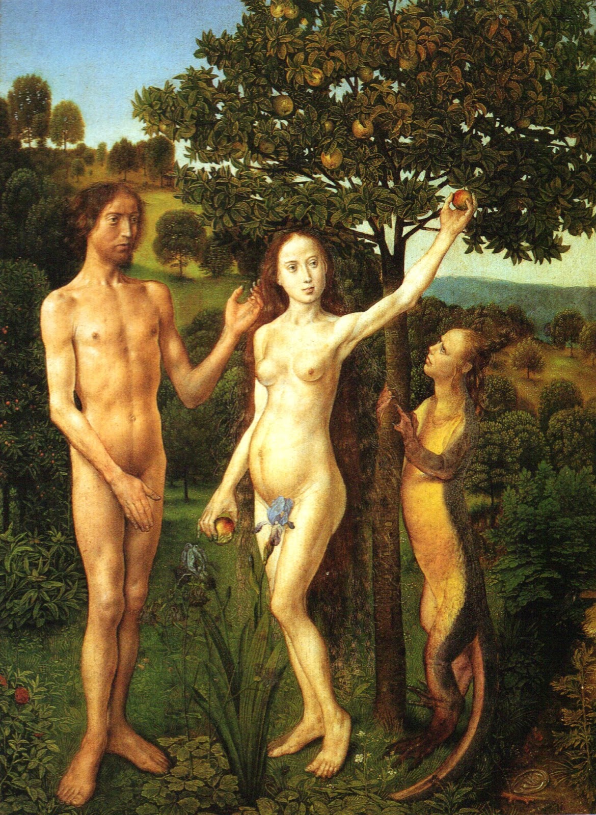 Adam and Eve alongside the Tree of Knowledge of Good and Evil in the Garden of Eden, together with the pre-cursed Serpent, interestingly portrayed here as a bipedal human-headed reptile or draconopides (click