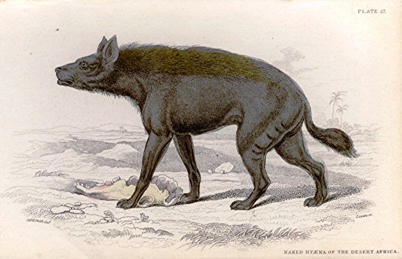 The original version of the Charles Hamilton Smith/William Home Lizars illustration of the Nubian naked hyaena that appeared as Plate 27 inVolume II of The Natural History of Dogs...Including Also the Genera Hyaena and Proteles, published in 1840 (public domain)Four species of modern-day hyaena are presently recognised by science – the spotted hyaena Crocuta crocuta, the striped hyaena Hyaena hyaena, the brown hyaena Hyaena brunnea, and the aardwolf Proteles cristatus – all four of which possess a respectable (and sometimes notably shaggy) pelage. This is why a very unexpected discovery of mine has left me decidedly perplexed.