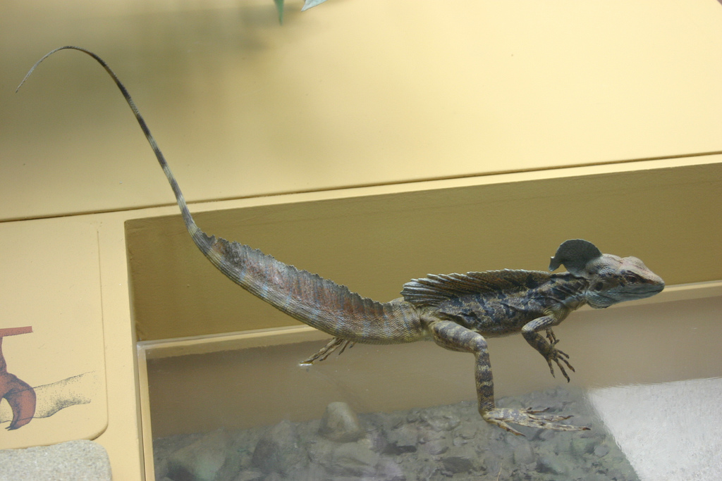 Certain lizards as known to adopt a bipedal running gait on occasion. Perhaps the most famous of these is the Australian frilled lizard Chlamydosaurus kingii, up to 2.75 ft long and which has often been likened to a raptor when sprinting bipedally. So have North America's collared lizards (genus Crotaphytus), which measure around 1 ft long. In South America, the basilisks (genus Basiliscus), up to 2.5 ft long, can do the same too, even sprinting bipedally across stretches of water, and these are also commonly kept as pets in the U.S.A., so specimens may escape into the wild here on occasion. Indeed, the description of one bright green, crested, 2-ft-long, lengthy-tailed bipedal "baby dinosaur" allegedly caught then released by an 11-year-old boy in 1981 alongside some railway tracks in New Kensington, Pennsylvania, sounds just like one of these lizards, which by then were becoming quite popular as exotic pets in the States.