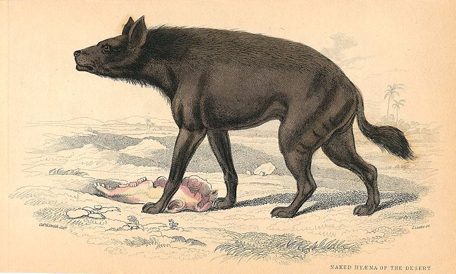 A third version of the Charles Hamilton Smith/William Home Lizars illustration of the Nubian naked hyaena (public domain)