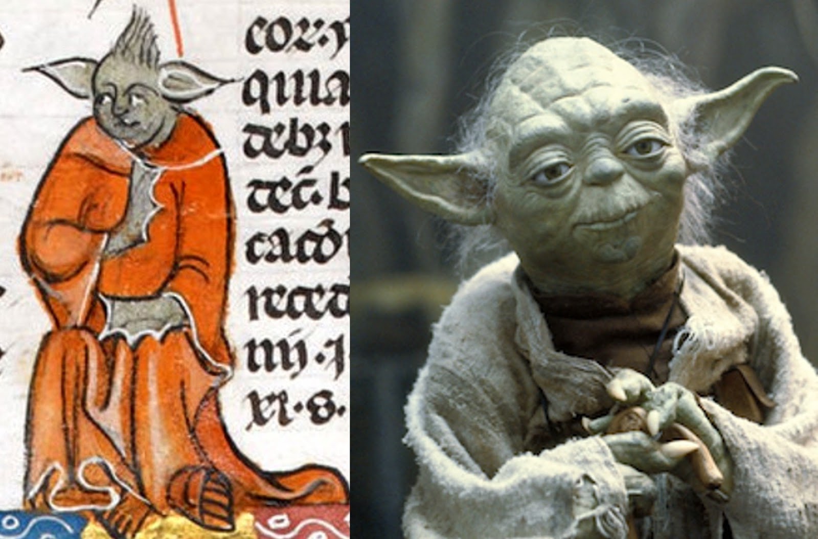 The mystifying monk-like entity from the Smithfield Decretals (left) alongside Yoda as seen in The Empire Strikes Back (right) (public domain/(© Lucasfilm Ltd-20thCentury Fox – reproduced here on a strictly non-commercial Fair Use educational/review basis only)However, the designer of Yoda's distinctive appearance, the late Stuart Freeborn (d. 2013), a British motion picture make-up artist, always stated that the character's face was based upon his own, and that his eyes were inspired by those of Einstein in order to give them a wise but kindly look. Moreover, it seems highly unlikely to say the least that back in the pre-internet years of the 1970s when he was creating Yoda's character, Freeborn was even aware of this exceedingly obscure centuries-old French manuscript, let alone had access to a copy of it.