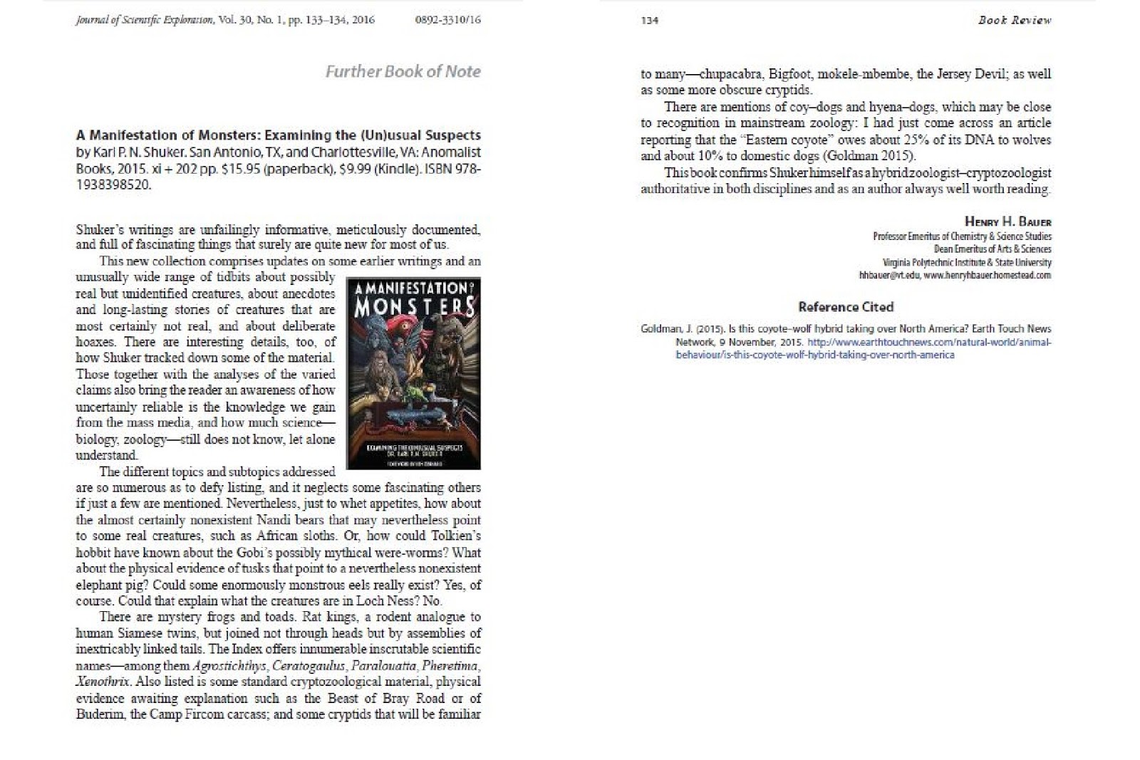 Below is a very positive review of my recent book A Manifestation of Monsters , which has just appeared in the Journal of Scientific Exploration (vol. 30, no. 1, pp. 133-134, 2016), and was penned by Prof. Henry H. Bauer, whose Loch Ness monster book, The Enigma of Loch Ness, remains one of the standard works on this cryptozoological subject.