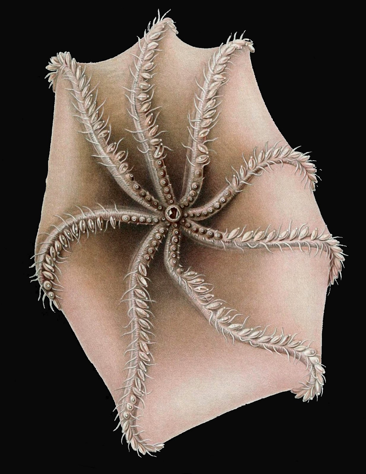 Exquisite illustration of various jellyfish species revealing their four centrally-sited gastric pouches, depicted by Ernst Haeckel (public domain)So perhaps the deadly hide is more than a myth after all, lurking like so many other maritime horrors reported down through the ages in the deep oceans' impenetrable black abyss, but only very rarely encountered by humankind – which in view of the dreadful fate that befell the hapless South Pacific shark in 1953 may be just as well!