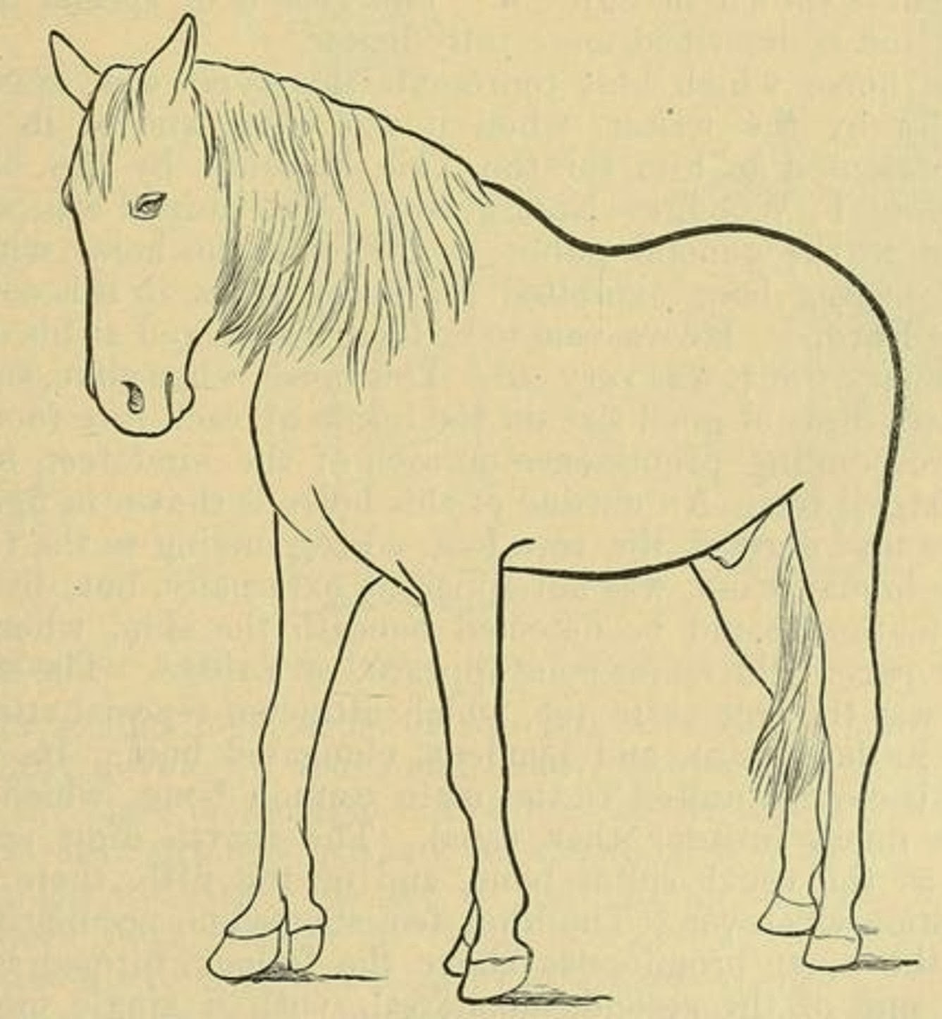 Line drawing of the 'eight-footed' Cuban horse examined by Prof. Othniel C. MarshThis horse, a male, was on exhibition in New Orleans during spring 1878, and it was Dr Sanford E. Chaillé from that city who drew Prof. Marsh's attention to it. The horse was subsequently brought to the North, and a few days later was displayed at New Haven, Connecticut, where Marsh closely examined it.