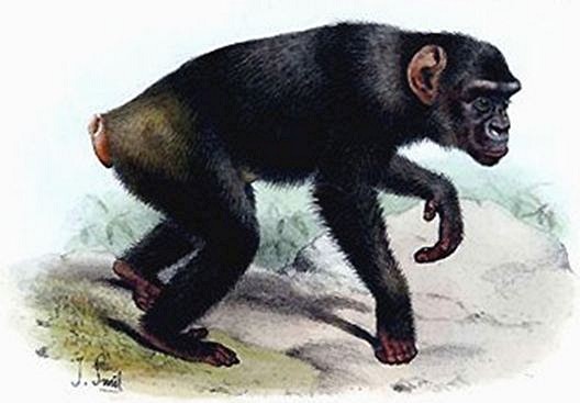 19th-Century engraving of a koolookambaConsequently, du Chaillu stated that he considered his specimen to be totally separate from both of these species. So too did the local native people - who claimed that this strange type of 'intermediate' ape lived exclusively in the mountains, never inhabiting lowland regions. They even had a special name for it - the koolookamba ('that which speaks 'kooloo''), after its distinctive call, 'kooloo' (and also spelt variously as koolokamba and koolakamba). Accordingly, in 1860 du Chaillu formally christened his newly-created species Troglodytes koolokamba - the first of several different scientific names, and identities, that would be applied to this ambiguous ape.