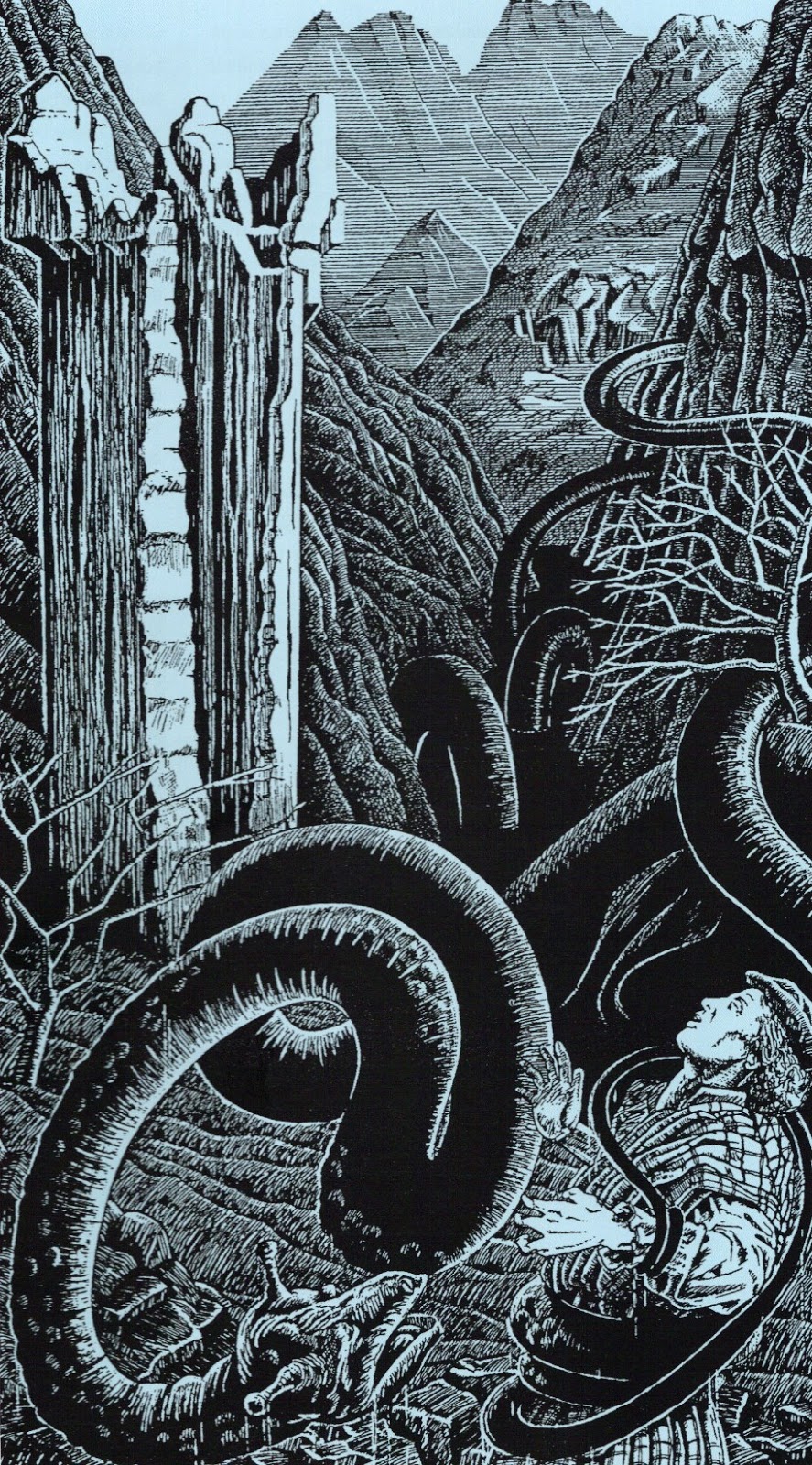 At the same moment, Frederick saw beside him the extraordinary quasi-botanical entity described above, with a semi-human face, long ears, yellow slanted eyes, and two stick-like arms. Before he had time to be surprised, however, he felt a pricking sensation in one of his hands, as if it had become entangled in some thorns - but when he looked, he discovered to his horror that the entity was draining blood from it, through its own fingers. Moreover, its eyes suddenly changed colour, becoming bright red and yielding a rotating, hypnotic effect that rendered its blood-sucking operation painless.