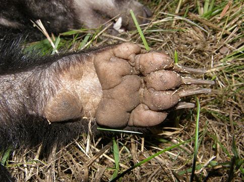 Badger paw, palm surface uppermost (http:// badgerwatcher.files.wordpress.com)In particular, as can be seen here, the plantar (palm) pad of the badger was very different in form from that of this paw, and the digits of the badger paw seemed much shorter and broader than those of the latter. There was also the latter's distinctive mosaic-like skin patterning to explain.