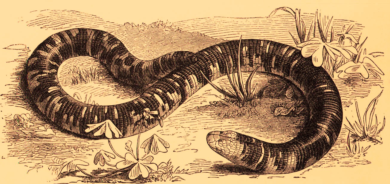 A 19th-Century colour engraving of a caecilian, Siphonops"Caecilians [constitute] a taxonomic order of entirely limbless species, many of which greatly resemble earthworms. Most are predominantly subterranean, fossorial species (although there are also some aquatic river-dwelling forms), and are rarely seen above-ground unless flushed out during rainfall. They inhabit wet tropical localities in Africa, Asia, and South America, feed principally upon insects and worms, and most are relatively small, but a few extra-large species also exist, growing up to 4 ft long and superficially similar in outward appearance to snakes.