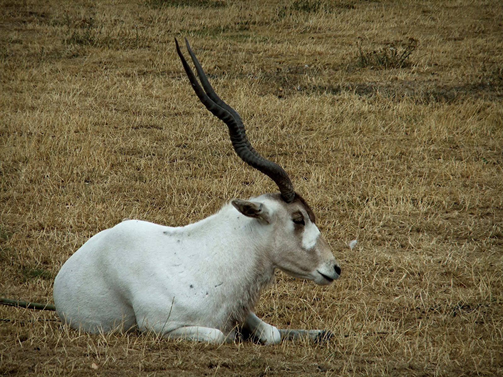 Driving through one of the ungulate paddocks at the safari park, I came upon an addax Addax nasomaculatus resting on the ground with head raised, the two spiralled horns of this pale Sahara Desert antelope perfectly discernible as I photographed it.