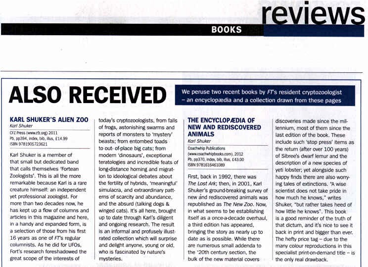 The following reviews of my latest books - Karl Shuker's Alien Zoo (CFZ Press: Bideford, 2010) and The Encyclopaedia of New and Rediscovered Animals (Coachwhip Publications: Landisville, 2012) - appear in the May 2012 issue of Fortean Times (FT #287), together with competitions to win signed copies of each of them. Check out the reviews below: