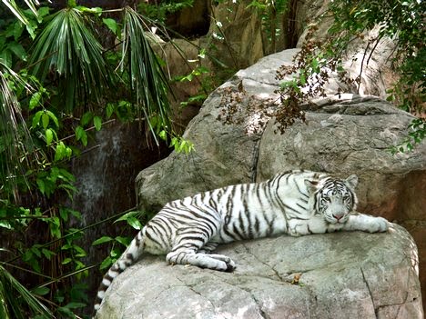 Typical white tigers possess narrow, but clearly discernible brown, black, or grey stripes, but very occasionally a specimen has been born that totally or virtually lacks any degree of striping. These white stripeless tigers are popularly referred to as snow tigers, of which perhaps the most famous examples are the magnificent individuals owned by American stage magicians Siegfried and Roy. They own a number of white tigers too, as well as white lions, which can be seen on display in their private wildlife park, 'The Secret Garden of Siegfried & Roy', at the Mirage Hotel in Las Vegas. While staying at the Mirage during my 2004 holiday on the Strip, I was able to see these exotic big cats personally.