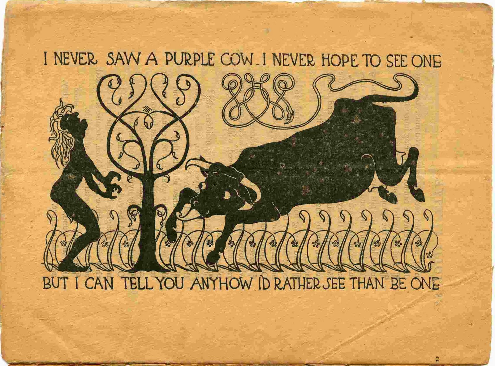 One of the shortest but most famous of all nonsense poems is 'The Purple Cow', penned by American author Gelett Burgess (1866-1951). It originally appeared in the first issue of The Lark, a magazine published in 1895 that was co-edited and (at least initially) largely written by Burgess. Here is the illustrated page from The Lark containing this poem: