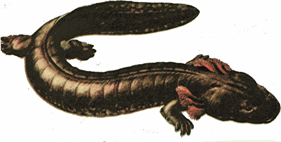 They were said to be at least 3 ft long but generally averaged 6-7 ft, were invariably pink in colour, sported large horns ("like a moose", according to one very startled eyewitness, a young carpenter), and were always associated with water. When their habitat suffered a great drought some time before 1820 that dried out many streams and wells, and suffered additional devastation via a terrible fire, the outcome was their extinction. If we equate these animals' 'horns' with prominent, branching external gills, rather like those of the much smaller axolotl of Mexico, these 'pink lizards' could indeed have been larval salamanders - but their size far exceeds any known species in North America, or anywhere else.