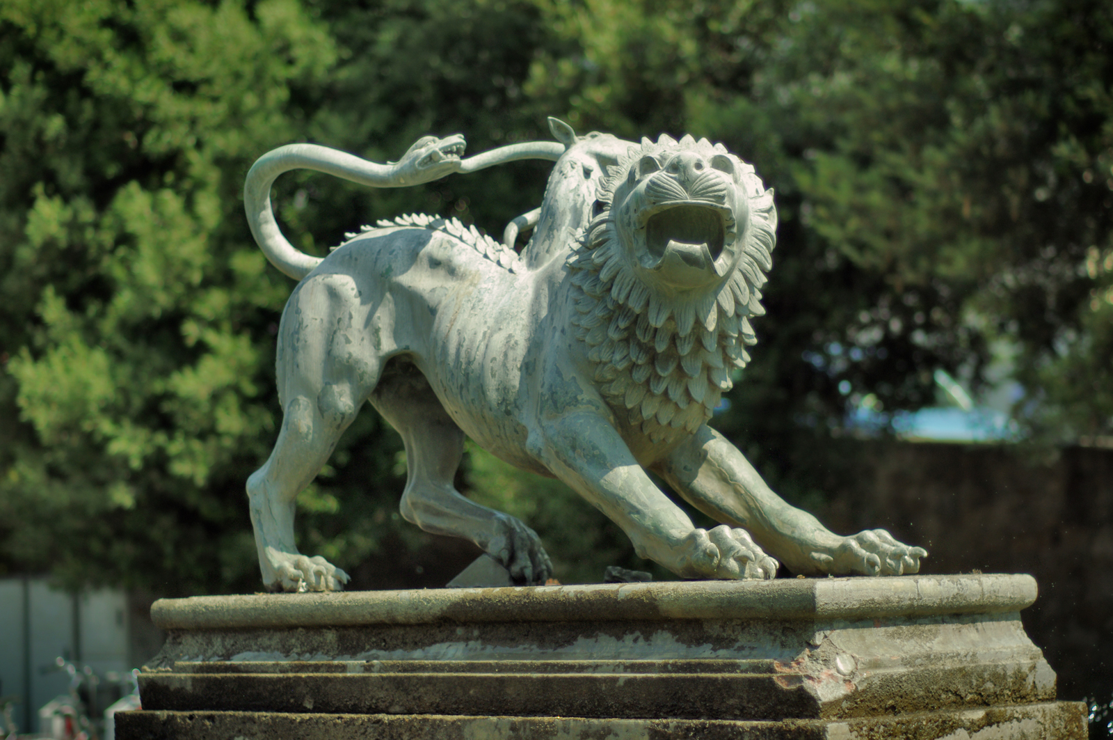 This terrifying beast took the form of a huge lion, but unlike any normal member of the leonine pride, the chimaera bore a second head, in the form of a horned goat's, sprouting forth from between its shoulders or its upper back (recollections may vary, as I believe someone once said recently…?), and a third head, in the form of a venomous snake's, at the end of its long, ever-thrashing tail. Moreover, as if all of that were not already more than sufficiently deadly for anyone to deal with, the chimaera also breathed fire, jetting forth great flames of destruction from the jaws of its primary, leonine head.