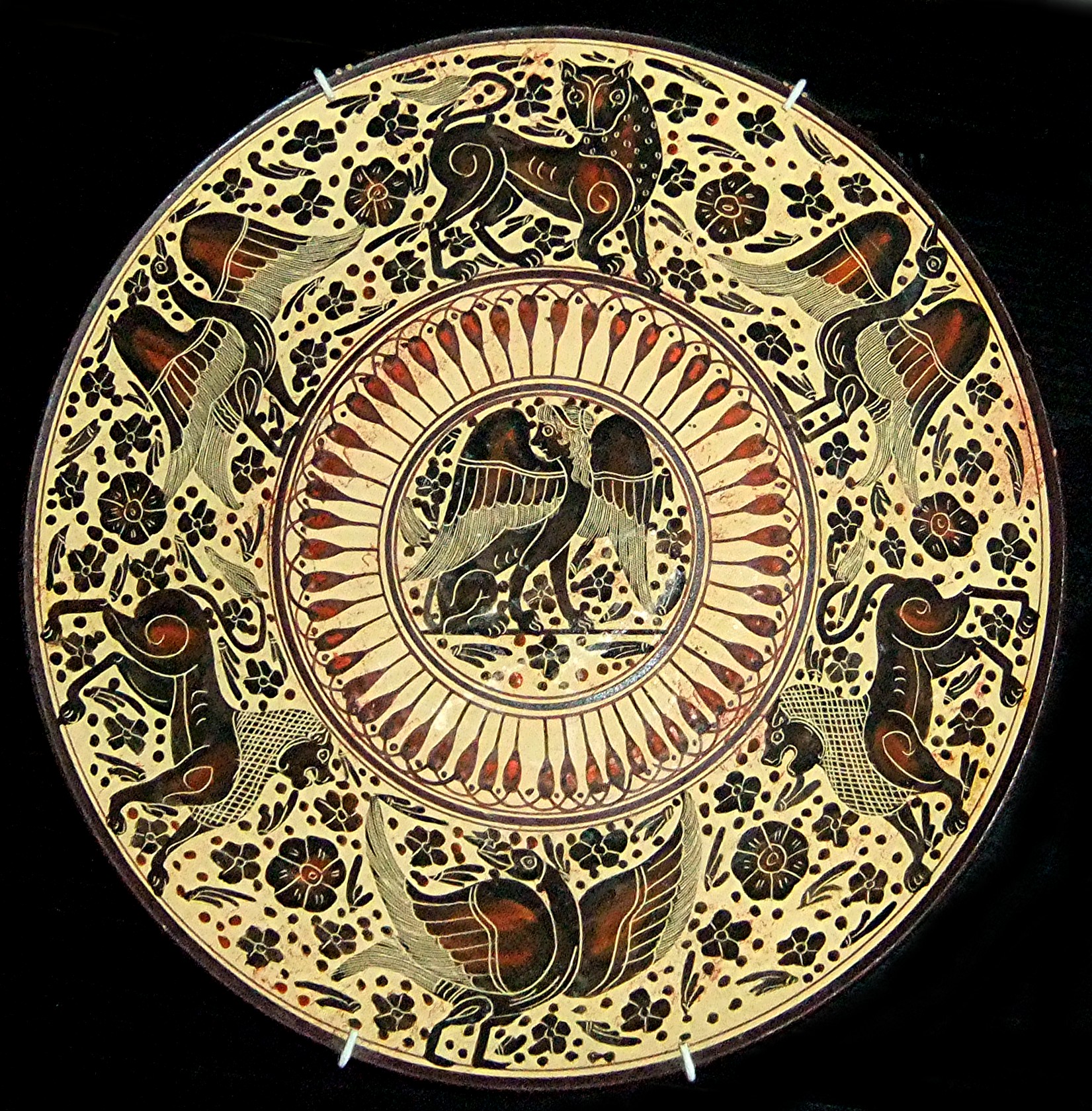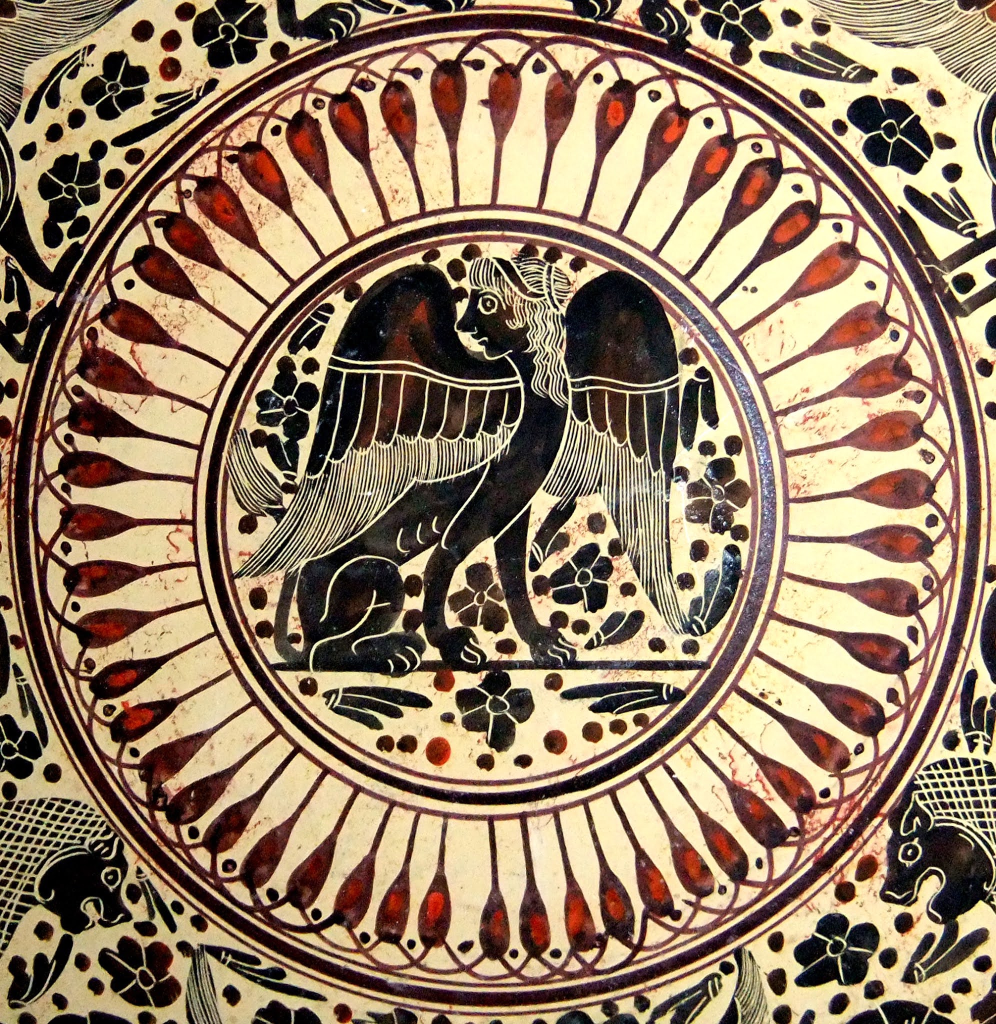 When I arrived back home, I unwrapped the plate and spent some time perusing its portrayed beasts. First and foremost to attract my attention was the gorgeously-detailed fabulous beast depicted at its centre, which I readily recognized to be a Greek sphinx, combining a lion's body with a woman's head, and winged. Egyptian sphinxes, conversely, combine a lion's body with a man's head, and are not winged.