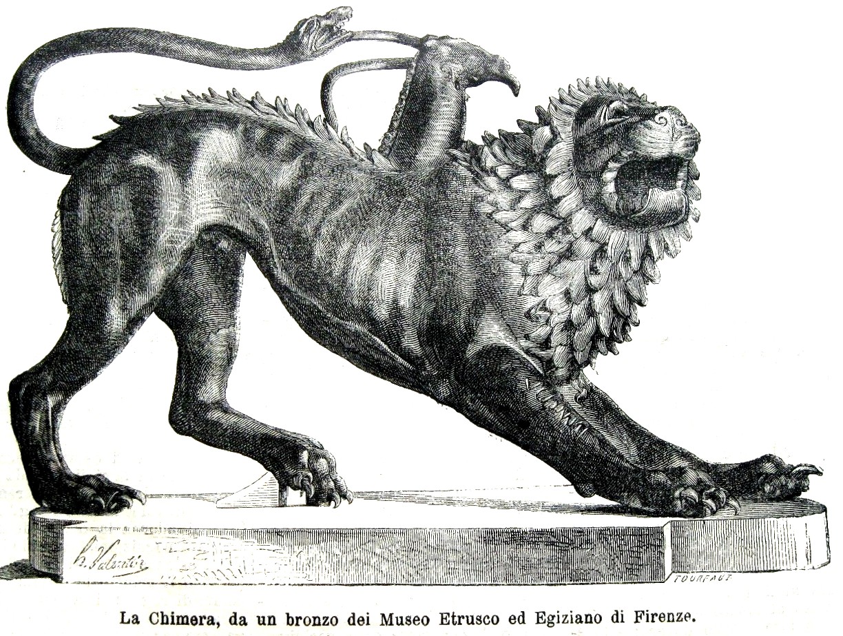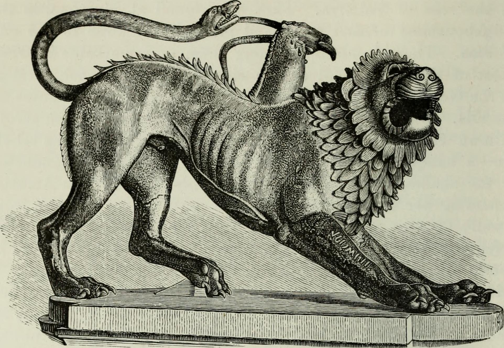 I thought nothing more of that strange-looking leonine statue for a long time, some years in fact, until one day I was idly flicking through a Larousse-published encyclopaedia of art that I'd lately purchased, and there, to my great surprise, was a photograph of a statue that looked exactly like the odd, spiky-maned lion that I'd seen during that long-gone Sunday afternoon visit to Stratford – except that it wasn't a lion after all. Instead, it was a chimaera (=chimera), and no ordinary chimaera either, always assuming of course that any chimaera can ever be considered ordinary. But what exactly IS a chimaera?
