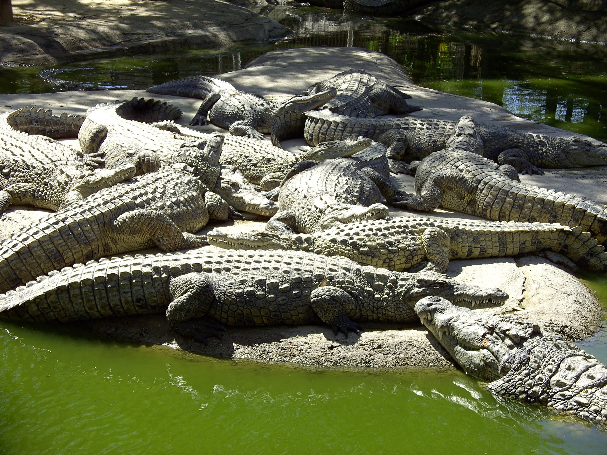 One of my first expeditions after reaching Caráchi [Karachi] was a visit to the Magar Taláo, as it is called, or Lake of Alligators. This curious place is about eight miles from Caráchi. and is well worth inspecting to all who are fond of the monstrous and grotesque. A moderate ride through a sandy and sterile track varied with a few patches of jungle, brings one to a grove of tamarind trees, hid in the bosom of which lie the grisly brood of monsters. Little would one ignorant of the locale suspect that under that green wood in that tiny pool, which an active leaper could half spring across, such hideous denizens are concealed. "Here is the pool," I said to my guide rather contemptuously, "but where are the alligators?" At the same time I was stalking on very boldly with head erect, and rather inclined to flout the whole affair, naso adunco. A sudden hoarse roar or bark, however, under my very feet, made me execute a pirouette in the air with extraordinary adroitness, and perhaps with more animation than grace. I had almost stepped on a young crocodilian imp about three feet long, whose bite, small as he was, would have been the reverse of pleasant. Presently the genius of the place made his appearance in the shape of a wizard-looking old Fakir, who, on my presenting him with a couple of rupees, produced his wand — in other words, a long pole, and then proceeded to "call up his spirits." On his shouting "Ao! Ao!" "Come! Come!" two or three times, the water suddenly became alive with monsters. At least three score huge alligators, some of them fifteen feet in length, made their appearance, and came thronging to the shore. The whole scene reminded me of fairy tales. The solitary wood, the pool with its strange inmates, the Fakir's lonely hut on the hill side, the Fakir himself, tall, swart, and gaunt, the robber-looking Bilúchi by my side, made up a fantastic picture. Strange, too, the control our showman displayed over his "Lions." On his motioning with the pole they stopped (indeed, they had already arrived at a disagreeable propinquity), and, on his calling out "Baitho," "Sit down," they lay flat on their stomachs, grinning horrible obedience with their open and expectant jaws. Some large pieces of flesh were thrown to them, to get which they struggled, writhed, and fought, and tore the flesh into shreds and gobbets. I was amused with the respect the smaller ones shewed to their overgrown seniors. One fellow, about ten feet long, was walking up to the feeding ground from the water, when he caught a glimpse of another much larger just behind him. It was odd to see the frightened look with which he sidled out of the way evidently expecting to lose half a yard of his tail before he could effect his retreat. At a short distance (perhaps half a mile) from the first pool, I was shewn another, in which the water was as warm as one could bear it for complete immersion, yet even here I saw some small alligators. The Fakirs told me these brutes were very numerous in the river about fifteen or twenty miles to the west. The monarch of the place, an enormous alligator, to which the Fakir had given the name of "Mor Saheb," "My Lord Mor," never obeyed the call to come out. As I walked round the pool I was shewn where he lay, with his head above water, immoveable as a log, and for which I should have mistaken him but for his small savage eyes, which glittered so that they seemed to emit sparks. He was, the Fakir said, very fierce and dangerous, and at least twenty feet in length.