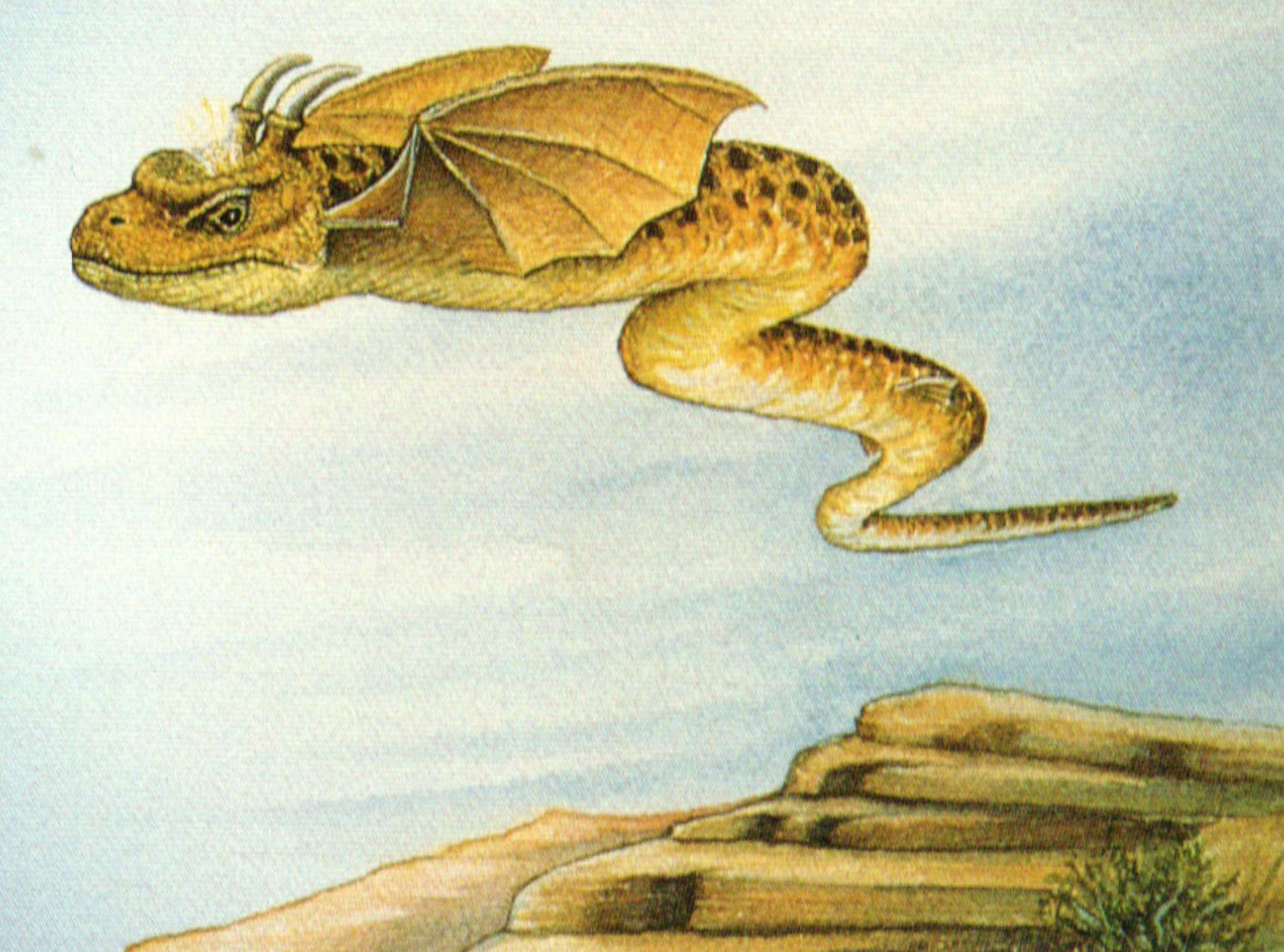Eyewitnesses have stated that this extraordinary snake launches itself from the summit of a high rocky ledge, then soars down to the ground, landing with an appreciable impact and producing scaly tracks in the dusty earth. In 1942, while tending sheep in the mountains at Keetmanshoop, teenager Michael Esterhuise threw a stone at what he had assumed to be a large monitor lizard lurking inside a rocky crack. When it emerged, however, it revealed itself to be a big snake with a pair of wing-like structures projecting from the sides of its mouth.