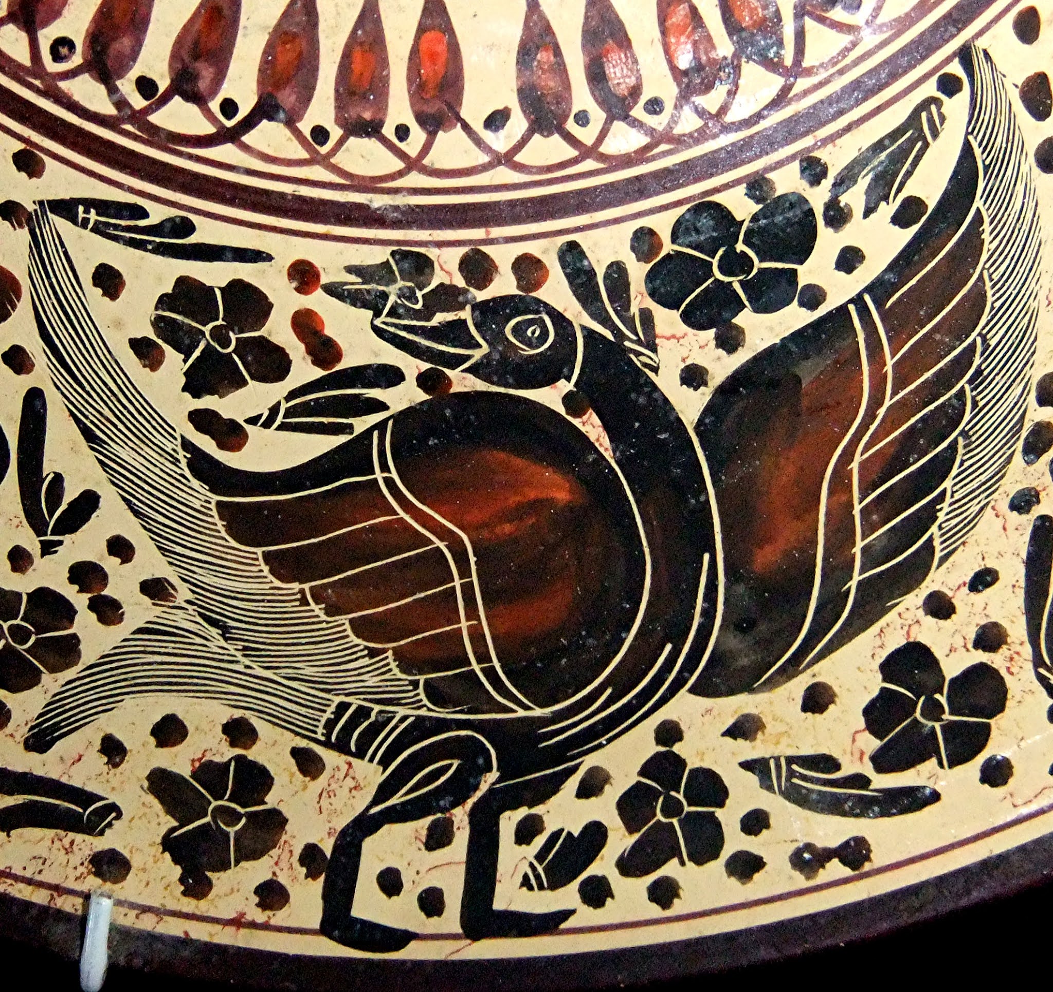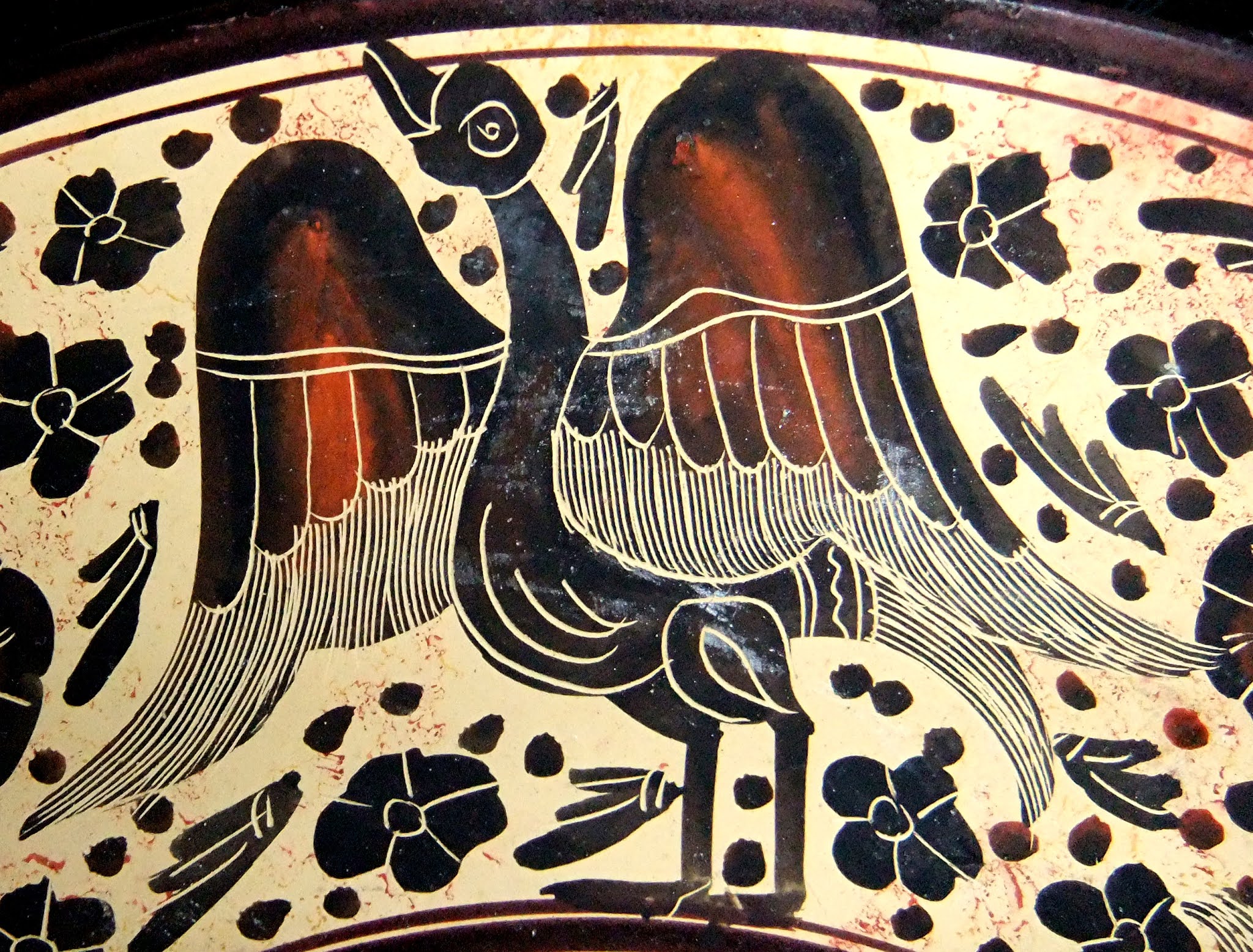 This left four other creatures still to identify, and this is where it became rather more difficult, at least initially. Three of these – positioned bottom-centre, near top-left and near top-right – were depictions of a very distinctive, unusual type of bird. It sported a long swan-like or goose-like neck, but its plumage's form and colouration did not match that of any swan or goose native to either Greece or its environs that I could think of. And yet it did seem strangely familiar somehow.