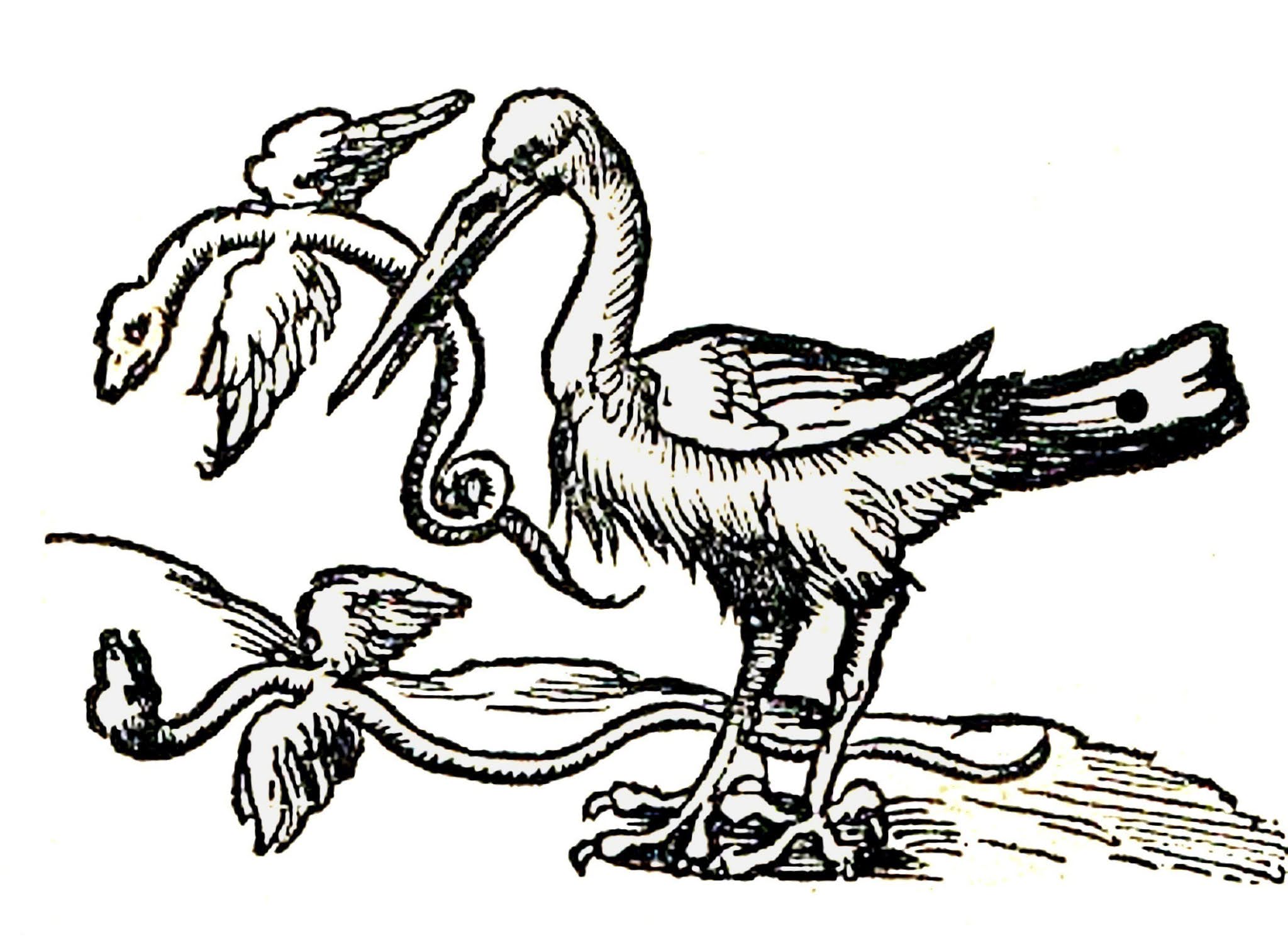 I went once to a certain place in Arabia, almost exactly opposite the city of Buto, to make inquiries concerning the winged serpents. On my arrival I saw the back-bones and ribs of serpents in such numbers as it is impossible to describe: of the ribs there were a multitude of heaps, some great, some small, some middle-sized. The place where the bones lie is at the entrance of a narrow gorge between steep mountains, where there open upon a spacious plain communicating with the great plain of Egypt. The story goes that with the spring the winged snakes come flying from Arabia towards Egypt, but are met in this gorge by the birds called ibises, who forbid their entrance and destroy them all. The Arabians assert, and the Egyptians also admit, that it is on account of the service thus rendered that the Egyptians hold the ibis in so much reverence.