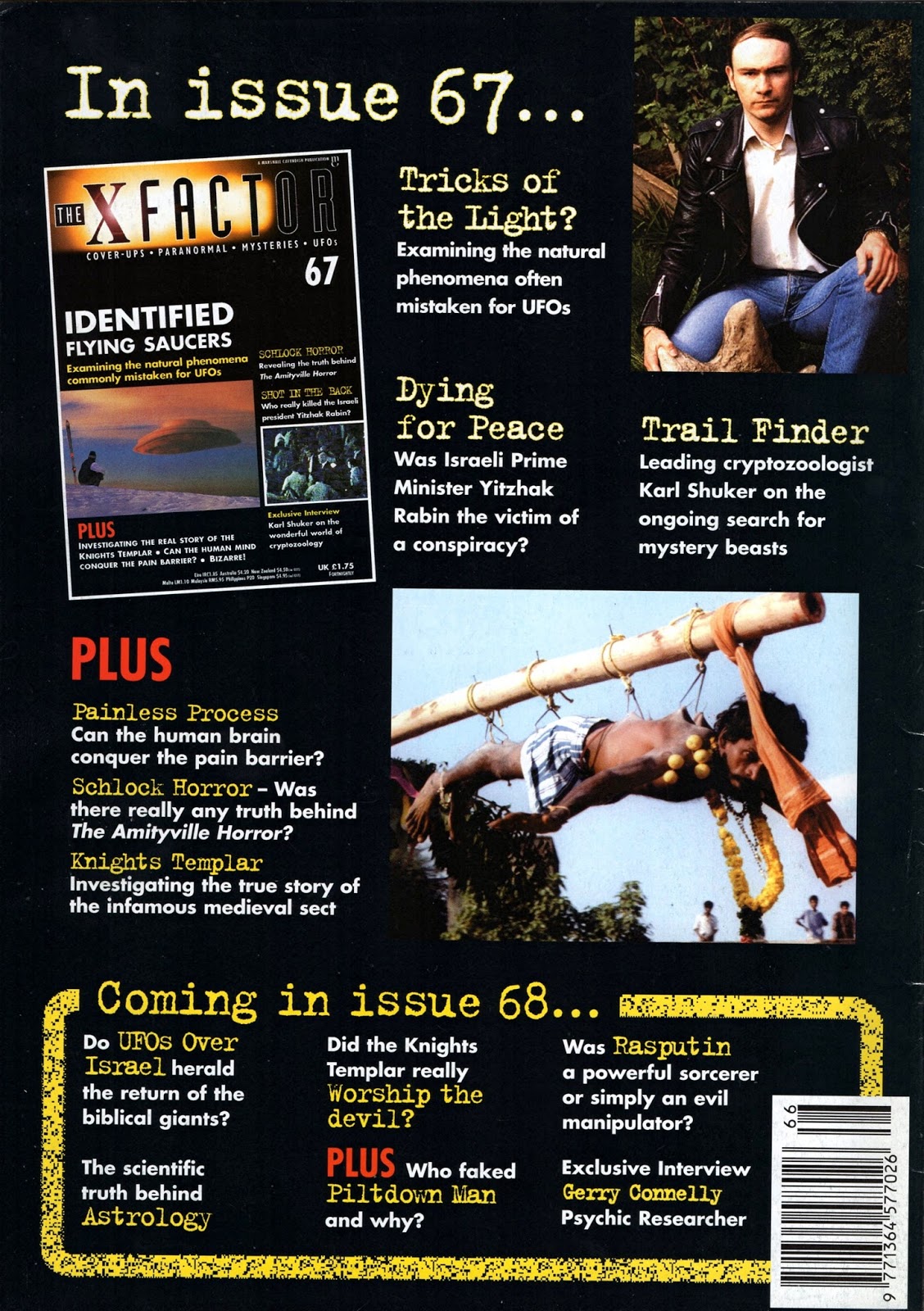 Back-cover X Factoradvertisement for issue #67, which contained CFZ founder Jonathan Downes's interview with me - click picture to enlarge it for reading purposes (© Marshall Cavendish Limited – reproduced here on a strictly educational, non-commercial Fair Use basis for review purposes only)The X Factor was a singularly authoritative, fact-filled publication, in many ways the natural successor to an equally significant, earlier partwork, The Unexplained, which was originally published during the early 1980s. Yet whereas the latter has been republished many times and in a number of different formats, The X Factor has never reappeared, tragically, in spite of its considerable popularity, so its contents are nowadays not as readily obtainable. As a result, I have been contacted on numerous occasions down through the years by correspondents and other readers lacking the X Factorissue in question (or the entire series), asking whether there was any possibility of reading Jon's interview with me that featured in issue #67, way back in 1999.