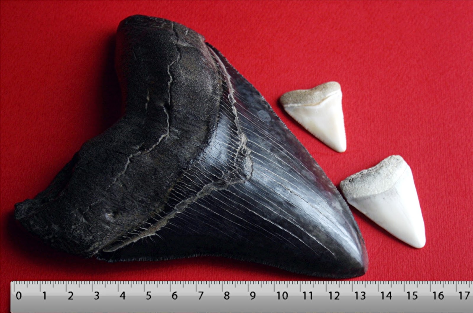 Megalodon tooth with two great white shark teeth and a metric ruler (© Kalan/Parzi/Wikipedia -