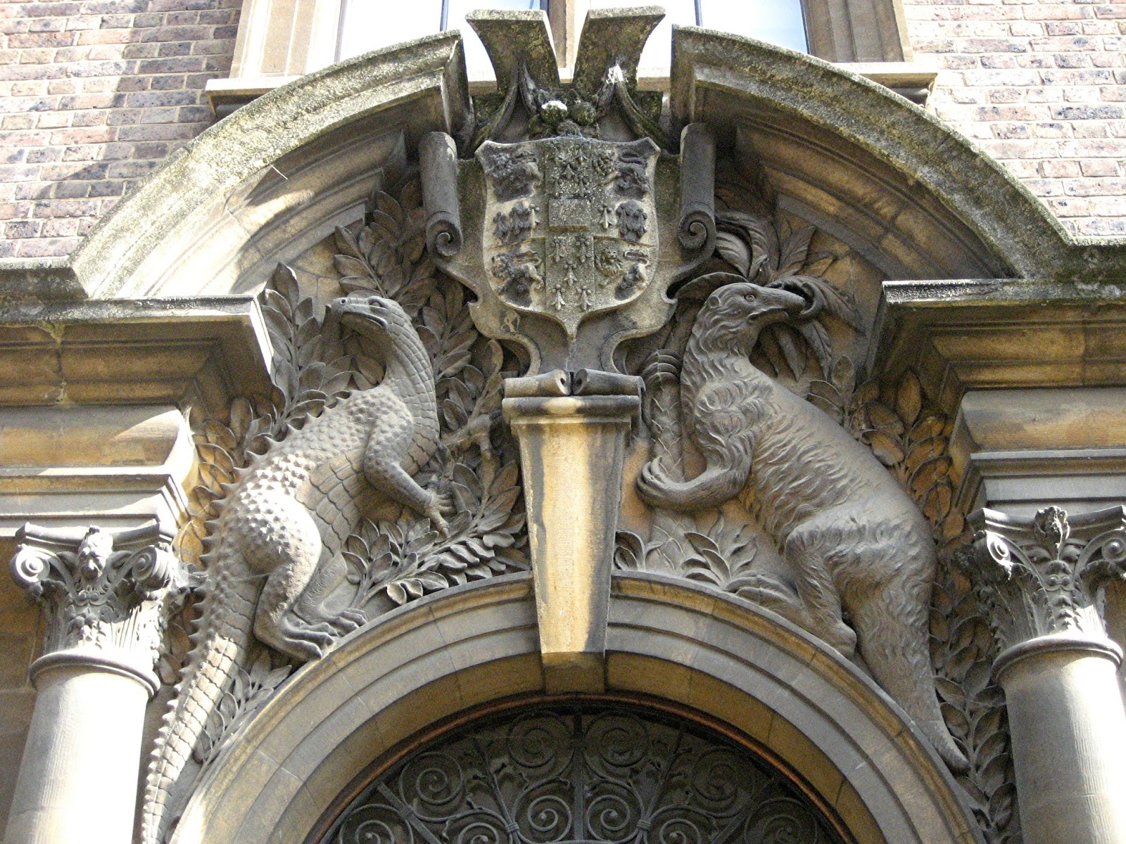 The Iguanodon and Megatheriumacting as supporters to the University of Cambridge's coat of arms, as carved above the archway of one of the entrances leading into the university's Sedgwick Museum of Earth Sciences (© Keith Edkins/Wikipedia –