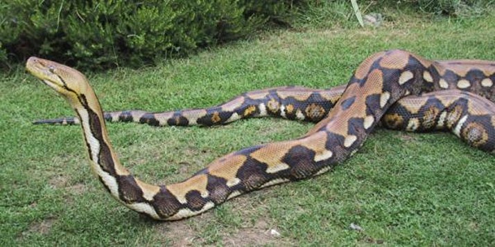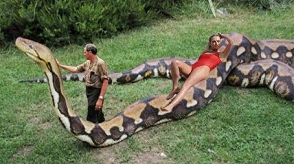 The snake portrayed in these fake photos is readily recognisable as a reticulated python Python reticulatus. Now, I am well aware that this species is the world's longest species of modern-day snake, with specimens regularly exceeding 20.5 ft, but even the current confirmed record-holder – a truly astonishing individual 32 ft 9.5 in long that was shot in 1912 on the Indonesian island of Sulawesi (=Celebes) – would not measure up in any sense of those words to the monstrous mega-python in the photographs under consideration here. Moreover, even forced perspective would be sorely challenged to yield a size-based visual illusion anywhere near as spectacular as the serpent depicted in them.