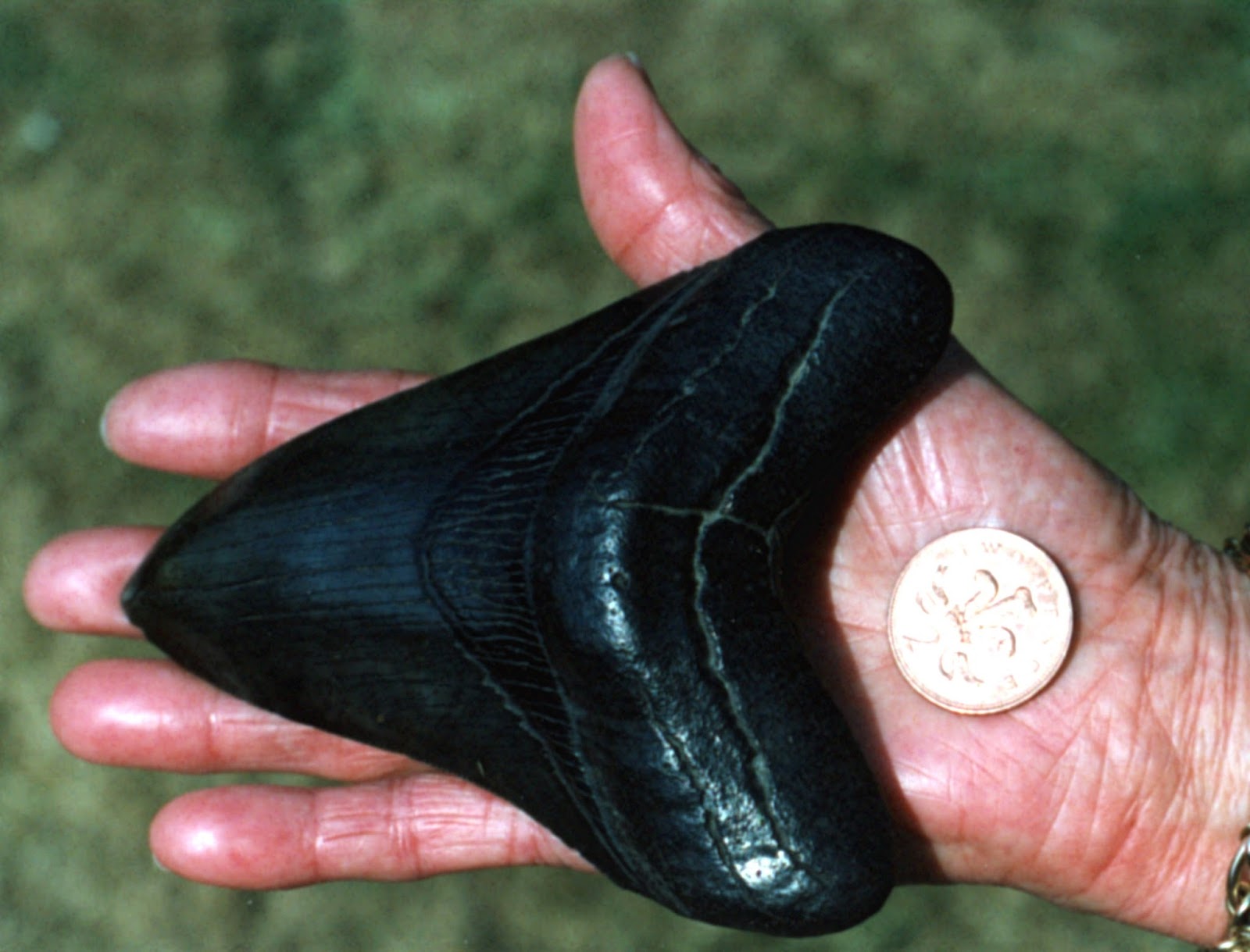 My mother Mary Shuker holding a fossil megalodon tooth with a 2 pence coin alongside it for scale purposes (© Dr Karl Shuker)The great white shark once had an even bigger relative - the megalodon or megatooth shark C. megalodon ('big tooth'), sometimes placed in its own genus, Carcharocles. Named after its huge teeth, which were triangular in shape, up to 7.25 in high, and edged with sharp serrations, the megalodon was once believed to measure as much as 98 ft long, but this early estimate of its size was later shown to be incorrect, and was refined to a much more sedate yet still unnerving 43 ft. However, after various extra-large megalodon teeth, some almost 6 in long, were unearthed a while ago at the aptly-dubbed Sharktooth Hill near Bakersfield, California, ichthyologists conceded that certain specimens might have attained a total length of up to 55 ft.