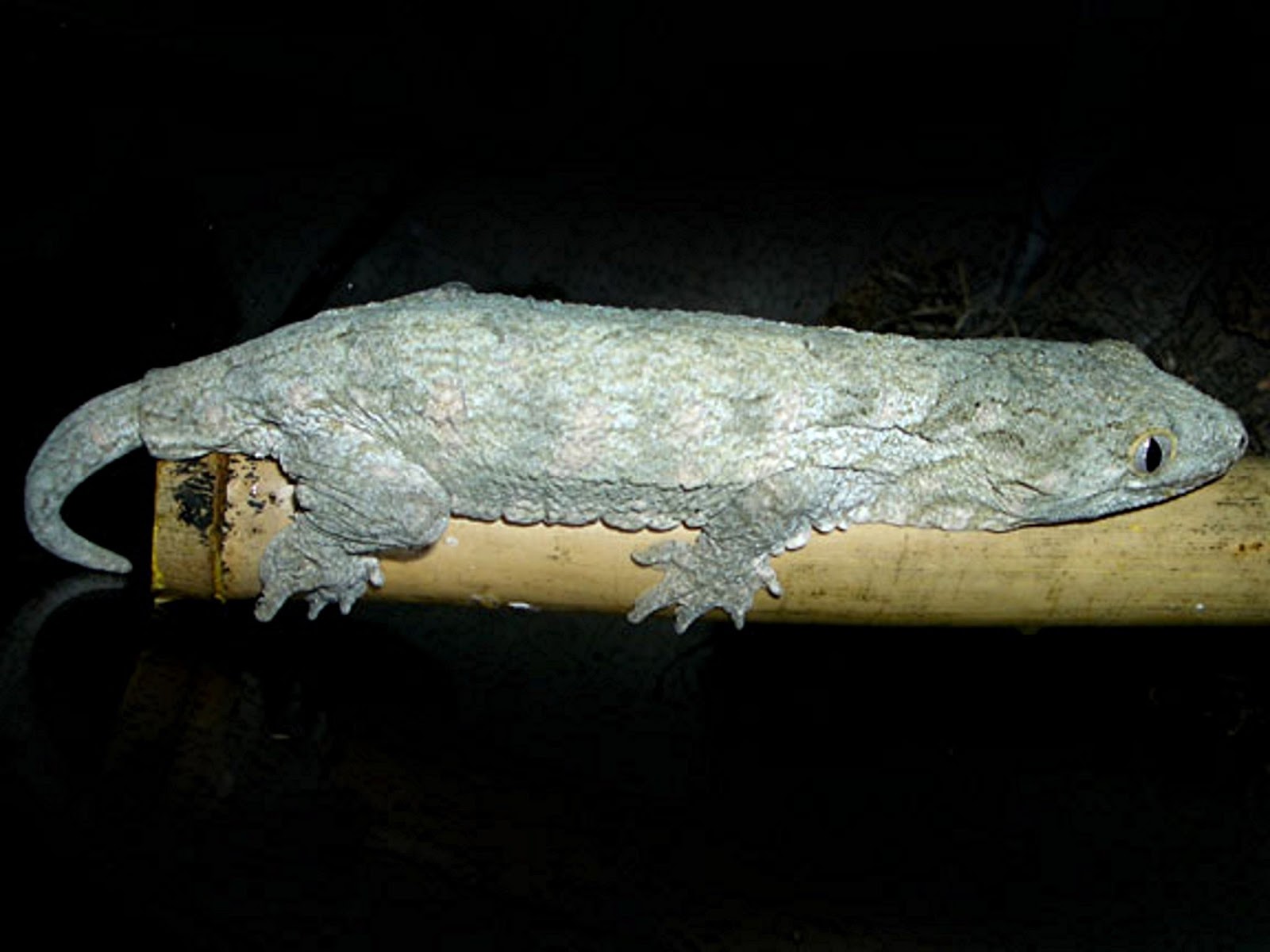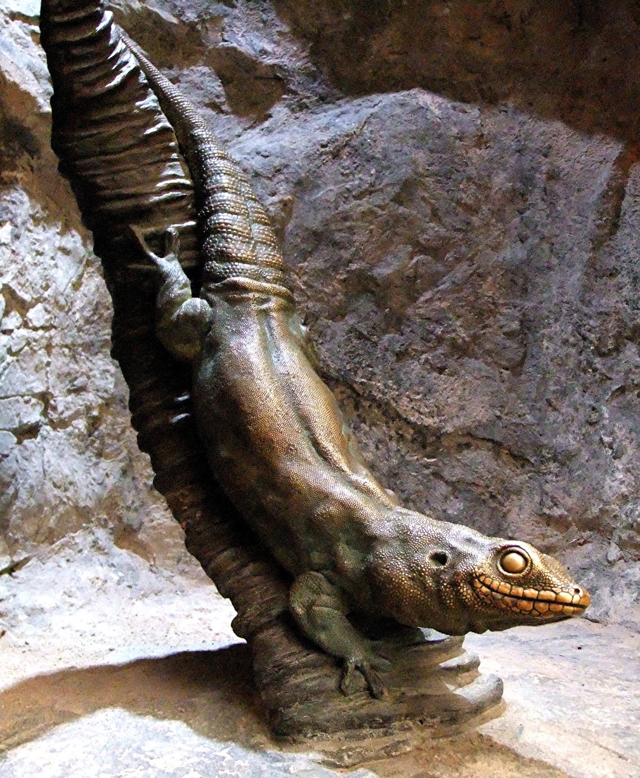Side view of the model of Delcourt's giant gecko featuring in the exhibition 'The Dear Departed' that was presented in 2000 by Lille Natural History Museum (© Lamiot-Wikipedia - CC BY-SA 4.0 licence)Happily, however, the second item, also uncovered in Earnscleugh Cave and documented in vol. 31 of the Transactions of the New Zealand Institute by Hutton in 1898 (not 1899, as often erroneously claimed), does still survive, and is housed in Canterbury Museum. It consists of a small (0.55-in-long) rib-like bone that Hutton referred to as "a supposed rib of the kumi, or ngarara". Bauer and Russell interpreted it as the cloacal bone of a gecko (but without physically examining it); if so, this would make it large enough to be consistent with H. delcourti as the species from which it originated. Conversely, Worthy does not believe that other taxonomic identities for it can be eliminated from consideration, stating: