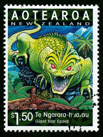 Ngarara portrayed upon a postage stamp issued by New Zealand in 2000 (© New Zealand postal services, reproduced here on a strictly educational, non-commercial Fair Use basis only)Yet another giant mystery lizard of New Zealand is the kumi. Although occurring chiefly in Maori folklore, a real-life example was reportedly encountered near Gisborne in 1898 by a Maori bushman. He claimed that it was around 4.5 ft long, and that it clambered up into a rata tree, leaving behind some footprints on the ground, which were apparently seen by other observers too.