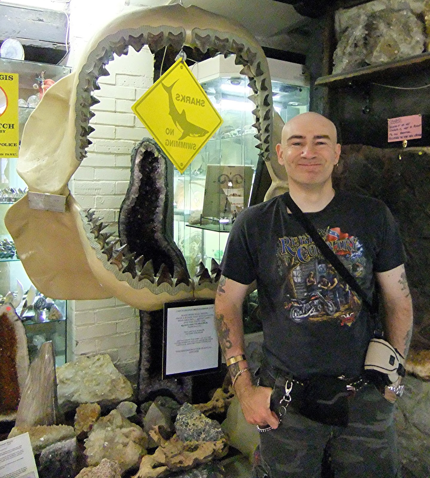 Alongside a life-sized recreation of megalodon jaws (© Dr Karl Shuker)The megalodon first appeared in the fossil record around 16 million years ago during the mid-Miocene, and was undoubtedly one of the most formidable marine predators of all time. So why, according to mainstream zoology, did it become extinct (if, indeed, it did!)? As yet, there is no definitive answer to this key question. However, the cooling of the oceans that occurred during the late Pliocene and Pleistocene in conjunction with the Ice Ages (an occurrence not conducive to the megalodon's survival, as it favoured warmer, tropical waters), coupled with the resulting migration towards colder, high-latitude regions by the larger whales that constituted its preferred prey (megalodon tooth marks on the fossil bones of such cetaceans are well documented), is the scenario most favoured as the cause of this giant shark's apparent extinction. Also, during the Ice Ages a substantial volume of seawater became locked inside continental ice sheets, thereby resulting in a significant worldwide fall in sea levels, which is something else that was not compatible with megalodon survival, restricting the number of nursery sites available for its juveniles' safe maturation.