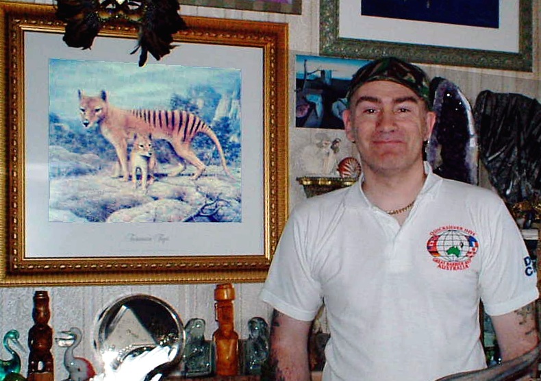 Alongside a thylacine picture in my study (© Dr Karl Shuker)Firstly, the revelation is entirely anecdotal (and not even first-hand), as there seems to be no physical, tangible evidence substantiating it. True, in an update of 20 August 2010 to an article of his own concerning this perplexing picture that he had originally posted on his Tetrapod Zoology blog two days earlier (click here to read it), British palaeontologist and cryptozoology chronicler Dr Darren Naish did point out an unidentified object in it that he interpreted as possibly being an artificial supporting structure, which if so would be consistent with the creature being merely a cardboard cut-out. But obviously this interpretation is merely a personal opinion, not a verified fact.