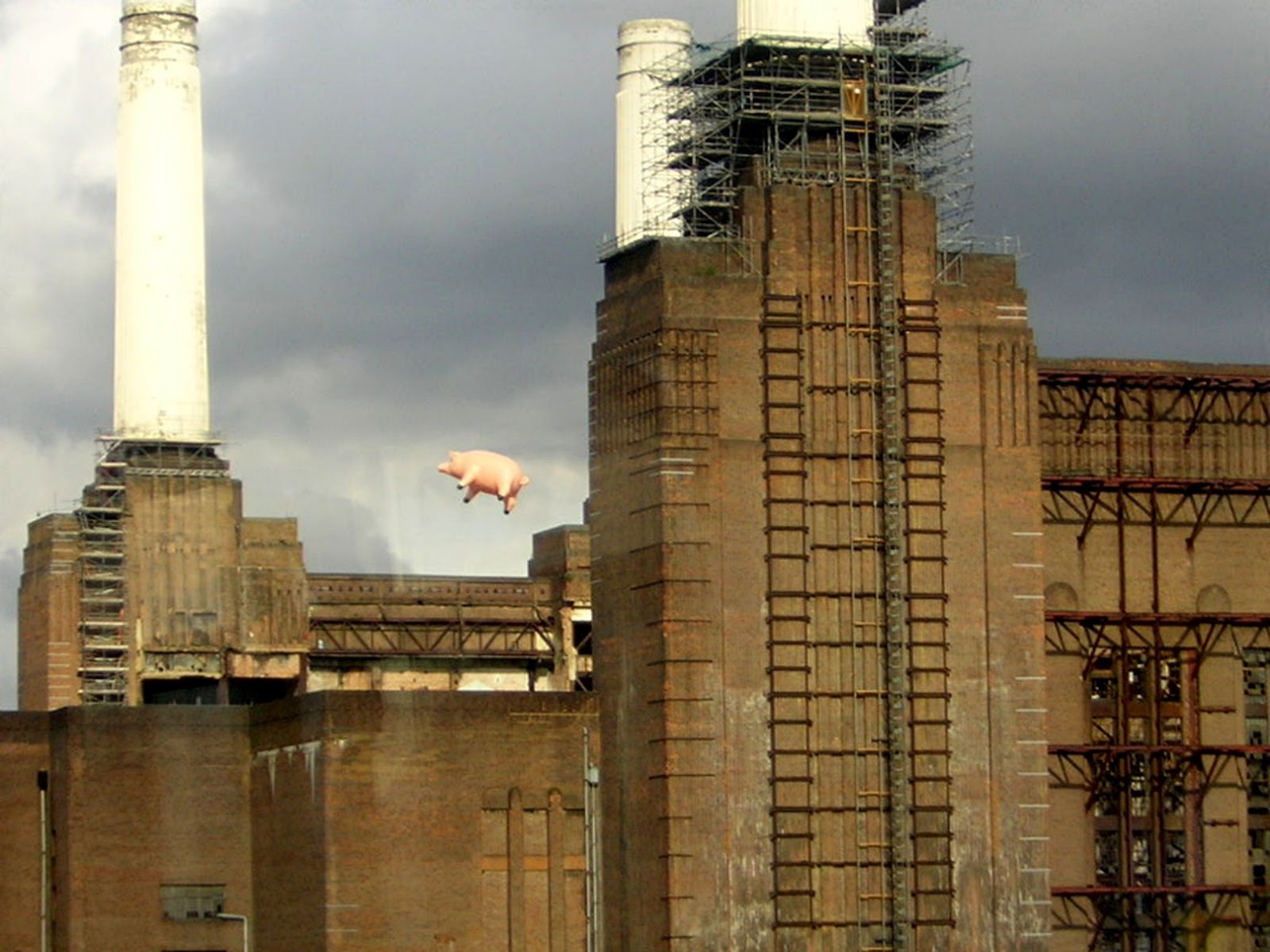 Giant pig balloon flying over Battersea Power Station, 26 September 2011, as part of Pink Floyd's Why Pink Floyd...? re-release campaign (© Bex Walton/Wikipedia -