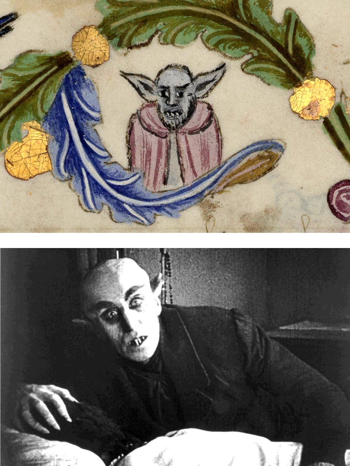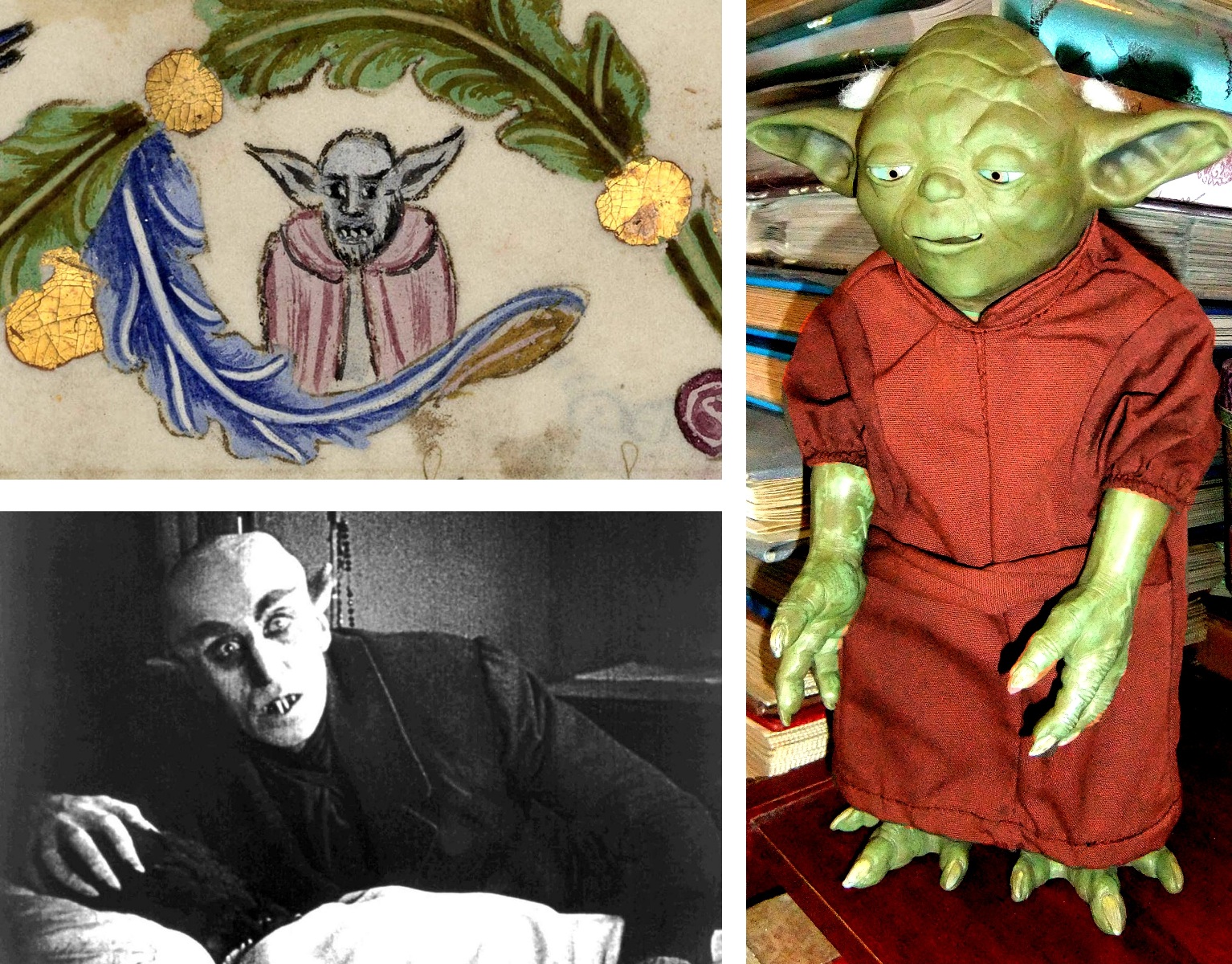 Three-way comparison featuring the cloaked figure from the Sankt Florian Psalter, Max Schreck's portrayal of Nosferatu, and my official model of Yoda (public domain/public domain/© Dr Karl Shuker)As noted in my ShukerNature article dealing with it ( here ), one popular explanation of this Yoda-like entity as depicted in the Smithfield Decretals is that in reality it may represent the devil attired as a demonic doctor of canon law, signifying that some clerics charged to uphold the law were actually corrupt and exploitative of their flock. Alternatively, it might simply represent a devil or demon in human form that is hoping to lure and tempt the unwary away from the paths of righteousness, and I consider it most likely that this or something similar is what the Sankt Florian Psalter's Nosferatu-like figure is intended to represent too. In religious imagery and classical western mythology, the donkey or ass is sometimes seen as an evil beast, so the addition of ass-like ears to a figure is a deft, easily-executed way of conveying visually the inherently malign nature of the figure, irrespective of his religious garb and other outward suggestions of piety and propriety.