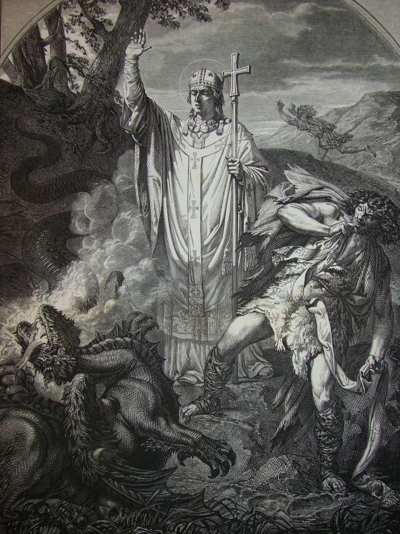The entire engraving from 1862 portraying St Romain abating the gargouille's power, with the murderer alongside him (public domain)Yet despite pleading for assistance from the region's besieged inhabitants, St Romain could not elicit the help of anyone to accompany him on his noble quest - until he encountered a prisoner condemned to death for murder. Mindful that his life was already forfeit, the prisoner had nothing to lose by facing a deadly water dragon in its grim lair - which is why he willingly agreed to journey with the archbishop even to what must have seemed like certain death.