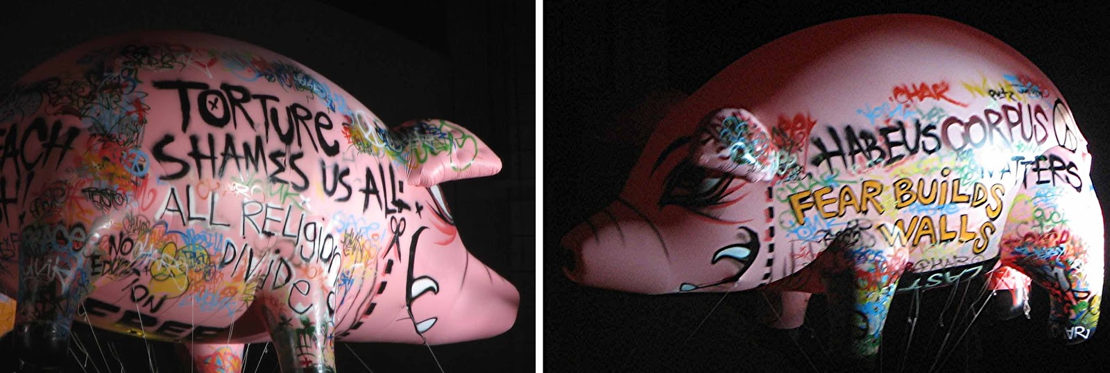 Two views of flying slogans-inscribed pig from Roger Waters show at Hollywood Bowl on 13 June 2007(© BeautifulFlying/Wikipedia -