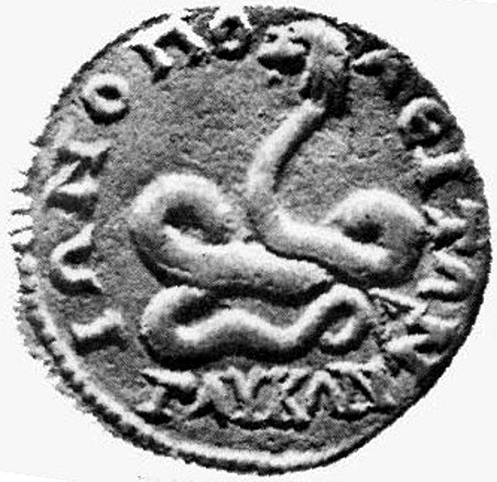 Glycon portrayed upon a 2nd-Century AD Ionopolis coin (copyright holder unknown, despite considerable searches by me; reproduced here on a strictly non-commercial Fair Use educational basis only)Returning to the matter of the mobility and loquacity of Glycon's head, it would be very prudent here to quote Steve's take on Lucian's assertions regarding this: