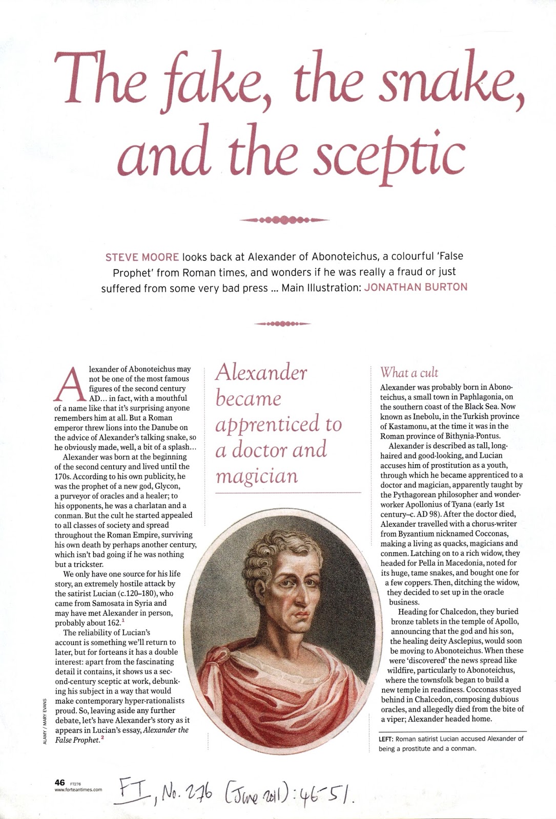 Traditionally, this vicious character assassination of Alexander by Lucian in literary form has tended to be viewed uncritically by those modern-day scholars actually aware of it (with Glycon in particular being among the Roman Empire's least-known figures of interest nowadays). However, all of that changed dramatically in June 2011, with the publication of a fascinating, eye-opening article presenting a very erudite reappraisal of Alexander, Glycon, and their portrayal by their longstanding nemesis Lucian. Published in the British monthly periodical Fortean Times (which is devoted to the serious investigation and chronicling of unexplained and controversial phenomena of every conceivable - and inconceivable! – kind), the article was authored by Steve Moore, a highly-respected veteran researcher of ancient Asian and European mysteries, and it directly challenged many of Lucian's long-accepted claims.