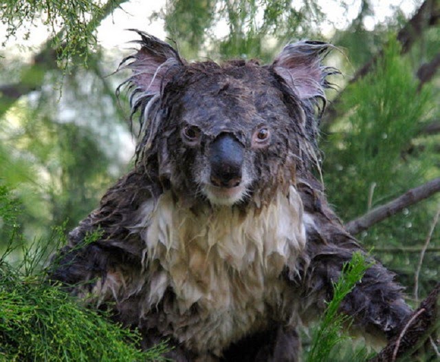 What this startling photograph (popularly dubbed the 'Angry Koala') does portray is a very wet koala, but no genuine koala has jaws like those snarling in savage fury at the camera. In reality, they are the jaws of some carnivorous creature that have been deftly added by person(s) unknown via photo-manipulation techniques to a photograph of a normal koala that was snapped on 30 January 2009 by an Australian photographer with the Flickr username Oz_drdolittle. It was one of three koalas sitting in a tree near his home in Adelaide, South Australia, during a 12-day heatwave, and which his garden's water sprinklers sprayed with water, thereby enabling them to cool them off. Below is his original, non-manipulated photograph, sans snarling jaws, and click here for his Flickr page that contains full details and additional photographs of what is now a world-famous koala, thanks to both its original unmodified picture and its drop bear 'alter ego' version having gone viral online during the past 6 years.