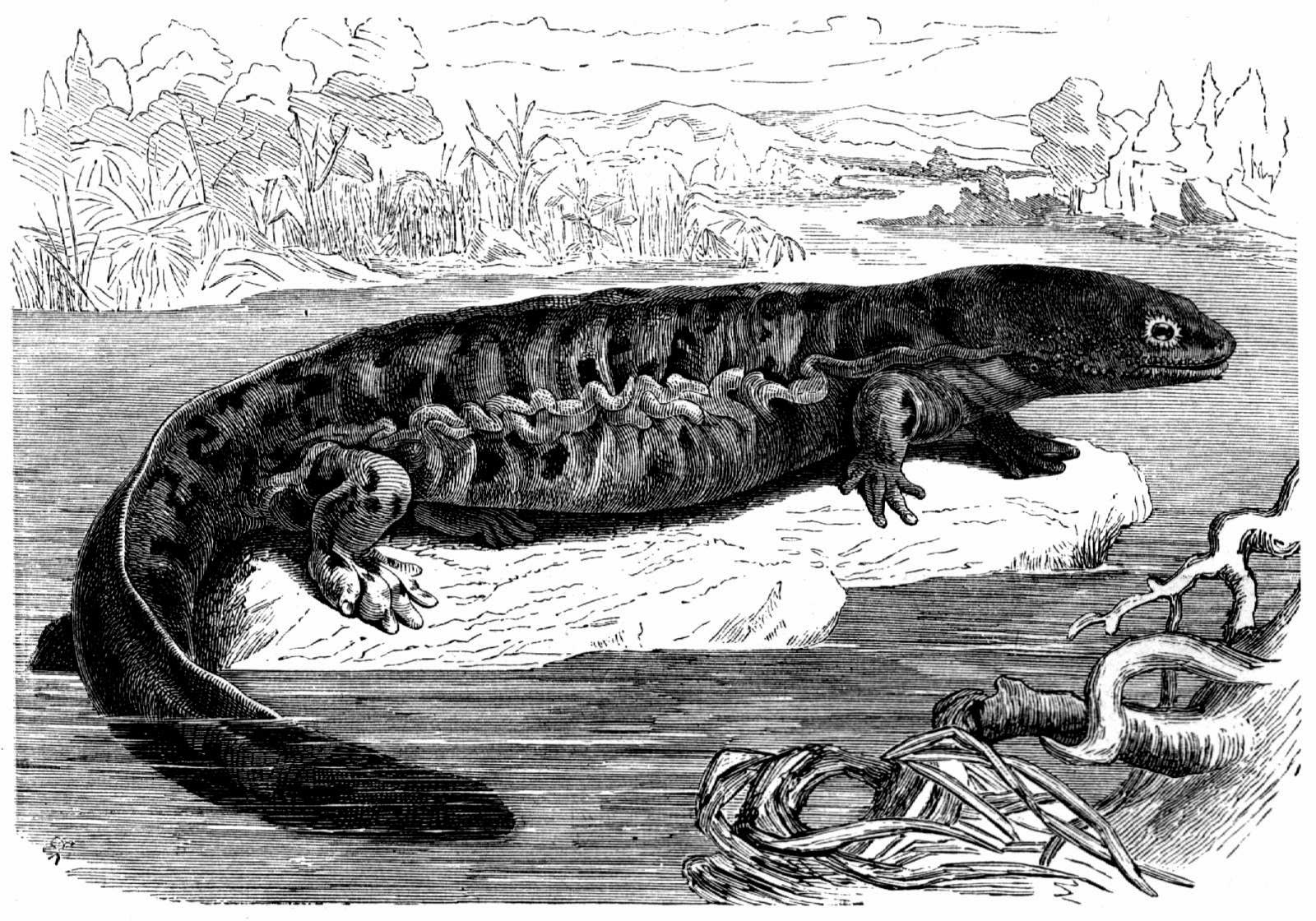 19th-Century colour-tinted engraving of a Japanese giant salamander viewed underwater (public domain)The details were sent to me by the eyewitness in question via a series of emails, which she has kindly given me permission to document publicly as long as I do not release her name (which I have on file). So I shall simply refer to her here as Prunella (not her real name).