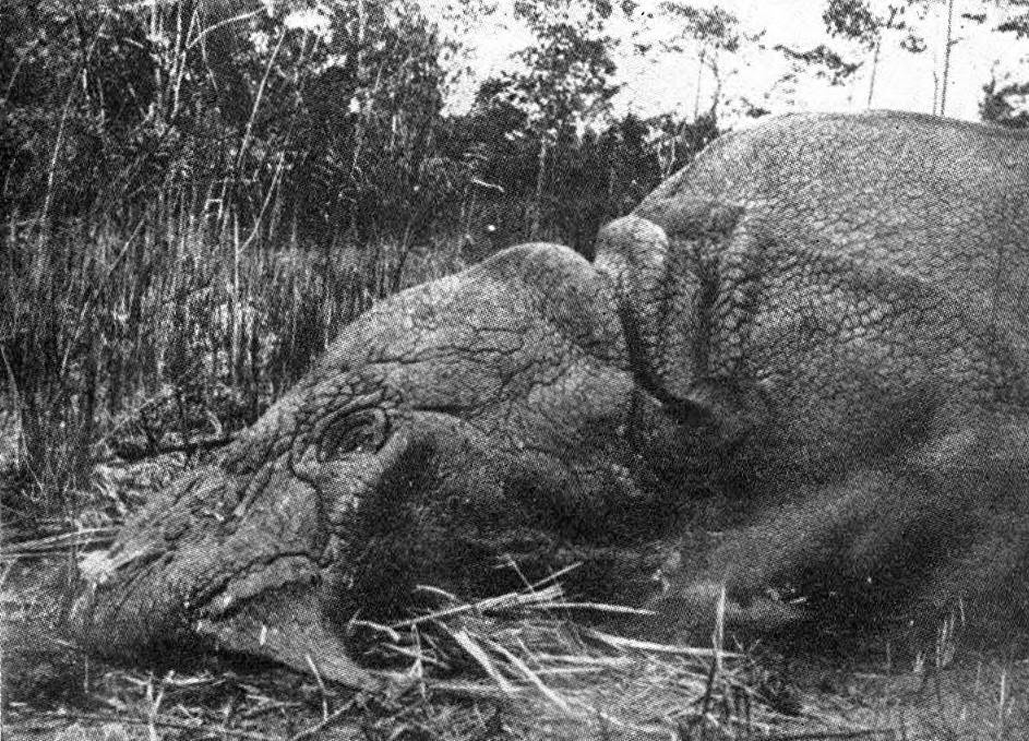 Close-up of the first Javan rhinoceros shot in Sumatraby J.C. Hazewinkel, revealing its distinctive scaly armour (public domain)Clearly, there can be no question that those eight Javan rhinos shot by Hazewinkel on Sumatra in the mid-1920s are one and the same as the eight Sumatran badak tanggiling shot by him and mentioned to Vageler by him during that same period. Moreover, as I discovered when researching this subject further, in 1926 Vageler actually published a short paper in Berliner Illustrirter Zeitung (plus two others a year later in Science News-Letter and Umschau) in which he formally described Sumatra's Javan rhinoceros merely as a new variety (not even a new subspecies) of the Javan rhinoceros, naming it Rhinoceros sundaicus [sic] var. sumatrensis.