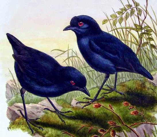 A 19th-Century painting by John Gould depicting a pair of lesser melampittas (public domain)No less mystifying are the two members of the genus Melampitta, from which they derive one of their two common names (the other one being ground-thrush). The more familiar of these two species is the lesser melampitta M. lugubris, whereas its larger relative, the greater melampitta M. gigantea, is less well-known; both species are endemic to remote rainforests in New Guinea. As their name indicates, in outward appearance they resemble black pittas, and were once classed within the pitta family (Pittidae), but in later years they have been transferred widely from one family to another, including the babblers (Timaliidae), the logrunners (Orthonychidae), the quail-thrushes and allies (Cinclosomatidae), the white-winged chough and apostlebird (Corcoracidae), and, inevitably, the birds of paradise.
