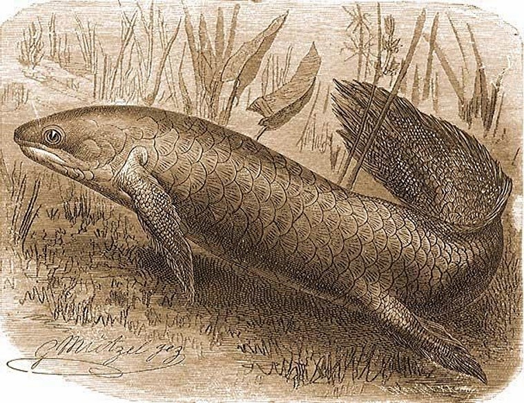 19th-Century engraving of the Australian lungfish (public domain)Dubbed the ompax by Australian ichthyologist Count Castelnau during the 1870s, a single specimen of it was eventually obtained, and its species was formally christened Ompax spatuloides. During the 1920s, however, the true nature of this specimen, and the ompax as a whole, was exposed, when a writer discovered that the specimen had been cleverly constructed from the body of a mullet, the tail of an eel, and the beak of a platypus! Exit the ompax from the ichthyological catalogue!
