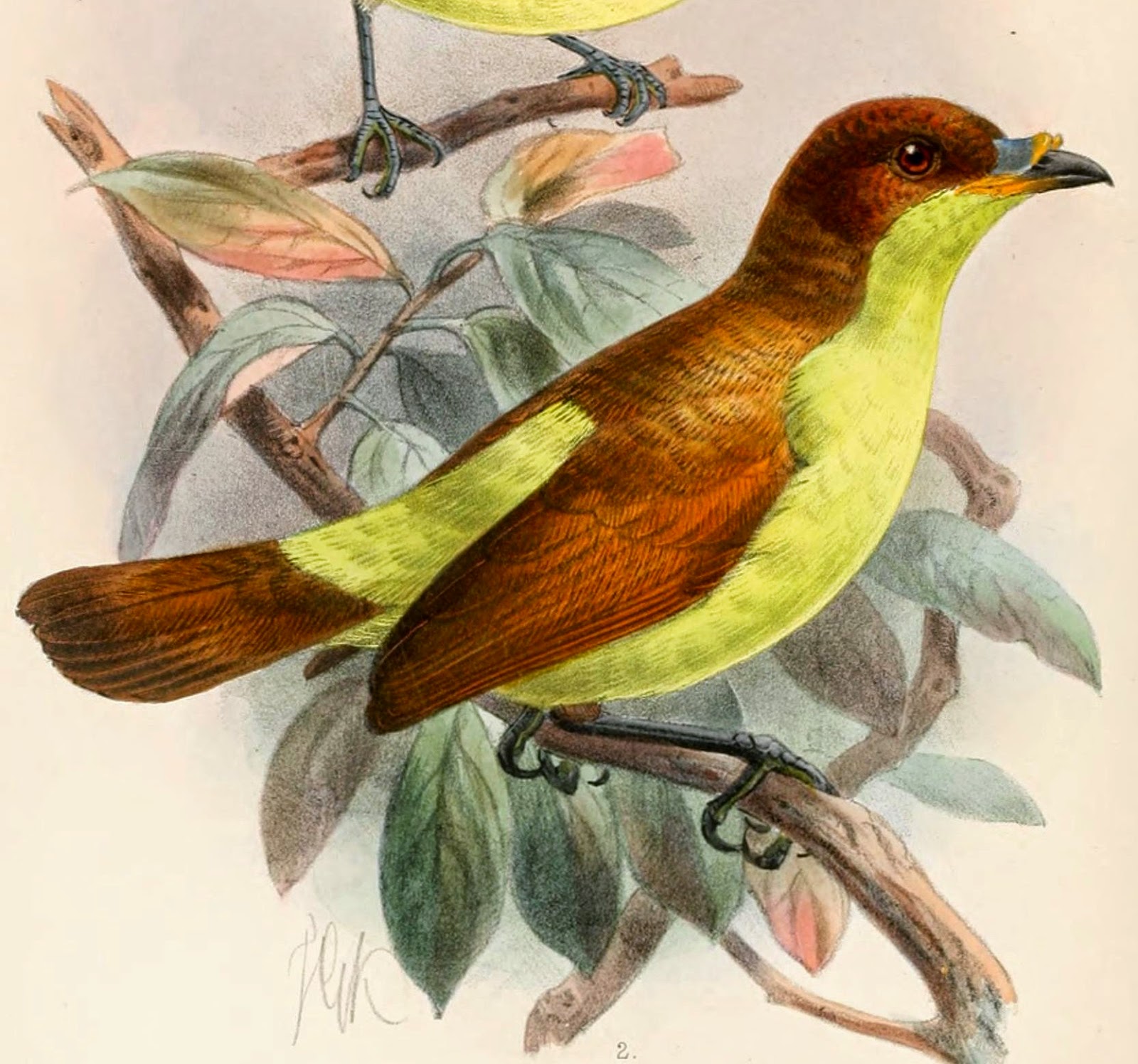 Painting of a yellow-breasted satinbird by John G. Keulemans, 1897 (public domain)As for the fourth false bird of paradise, Macgregoria pulchra, the only member of its genus and hitherto known as MacGregor's bird of paradise, which was formally described and named as far back as 1897, Cracraft and Feinstein had an even bigger shock in store. This was because their findings showed that it was not even a member of the superfamily Corvoidea, let alone the bird of paradise family Paradisaeidae. Instead, it was identified unequivocally as a honeyeater, i.e. belonging to the family Meliphagidae (whose numerous members occur widely across Australasia, the Pacific, and even into Bali), which in turn is housed within the superfamily Meliphagoidea.