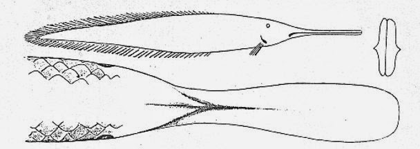 The only known preserved specimen of the gunni, now destroyed (© Ken Irwin)Staying with the subject of fabricated fauna Down Under: According to local tradition, a peculiar fish inhabited a single water-hole in Queensland’s Burnett River. Superficially, it resembled the Australian lungfish Neoceratodus forsteri that also lived in this river, but was instantly distinguished from that latter species and indeed from all known fishes by virtue of its long flat spatula-shaped beak.
