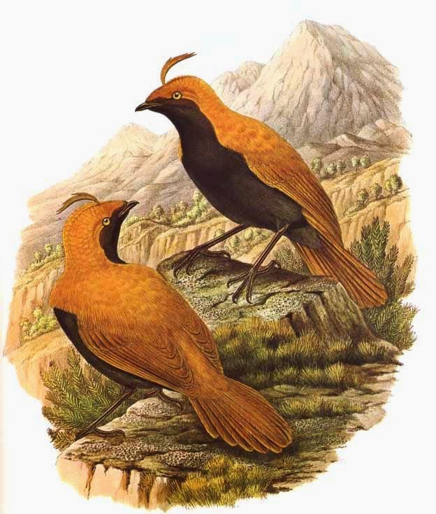 19th-Century painting of a pair of Loria's satinbirds (male on left) by John Gould (public domain)Three of these paradise-plumed pretenders constituted the former subfamily Cnemophilinae, whose trio of species had long been a source of ornithological contention as to whether their affinities did indeed lie with – or, more precisely, within – Paradisaeidae. Stripped of their 'bird of paradise' monikers, they are now referred to as satinbirds on account of their very soft plumage, and are known in full as: Loria's satinbird Cnemophilus loriae, the crested satinbird C. macgregorii, and the yellow-breasted or lobe-billed satinbird Loboparadisea lobata.