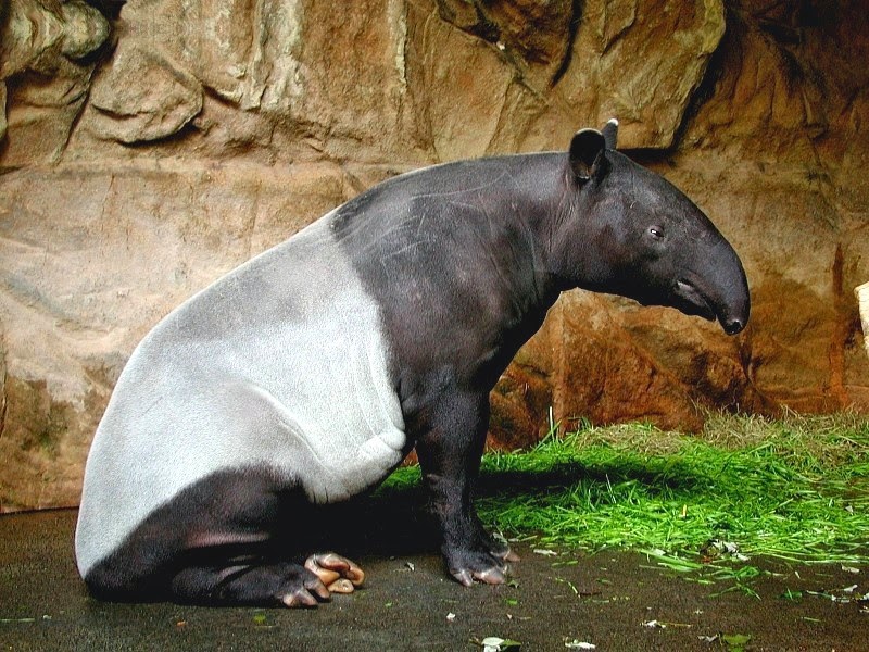 Malayan tapirs, depicted in a handsome chromolithograph from 1903 (public domain)Of the five modern-day species of tapir, four occur only in the New World and are uniformly dark brown/black in colour, whereas the fifth, the Malayan tapir Tapirus indicus, is an Old World speciality and is further differentiated by virtue of its 'saddle' - an area of striking white fur encompassing much of its torso and haunches (however, click here to check out a rare, all-black variant, known as Brevet's black tapir). Already known to exist in mainland Malaysia, Burma (Myanmar), Thailand, and the large Indonesian island of Sumatra, there is a good chance that this species' current distribution extends even further afield - onto the island of Borneo, where it supposedly died out only a few millennia ago during the Holocene, fossil remains having been found during cave excavations in the Borneo-situated Malaysian states of Sarawak and Sabah.