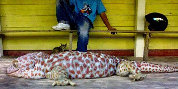 Tribun-Kaltim)The gecko specimen in question is actually a very familiar, widely-distributed Asian species known as the tokay gecko Gekko gecko, which is instantly recognisable by virtue of its bluish-grey body liberally patterned with bright red or yellow spots. Although the second largest species of gecko alive today, its maximum total length is a mere 20 in and its maximum weight no more than 0.4 kg. The reason why the specimen in the photograph seems so enormous is that it is sited very much closer to the camera than are the man and the cat sitting on (and under) the railing. This is a classic example of an optical illusion known as forced perspective, often seen in photographs and which, as effectively demonstrated here, can generate some very dramatic (as well as potentially deceiving) images when purposefully engineered.